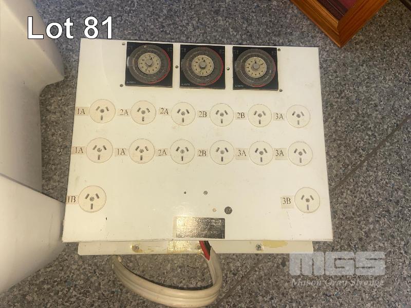 ASSORTED LIGHT & POWER FITTINGS, LED FLUSH MOUNT CEILING LIGHTS, 14 OUTLET POWER BOARD & TIMERS. & BALLASTS