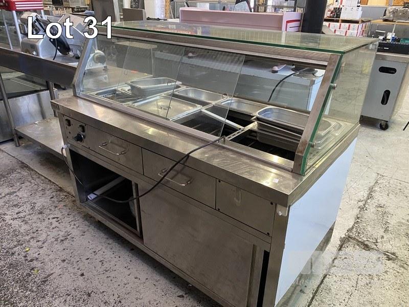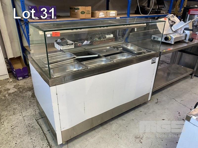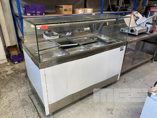 HEATED BAIN MARIE FOOD DISPLAY, FED MOD: PG150FE-YG, DOM: 2017, S/NO: PG150-YG, 4 x OVERHEAD HEAT LAMPS, CASTOR WHEELS, 11 x GASTRONORM TRAYS, 240V 10 AMP PLUG