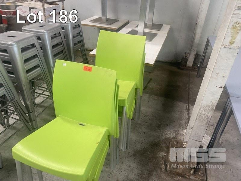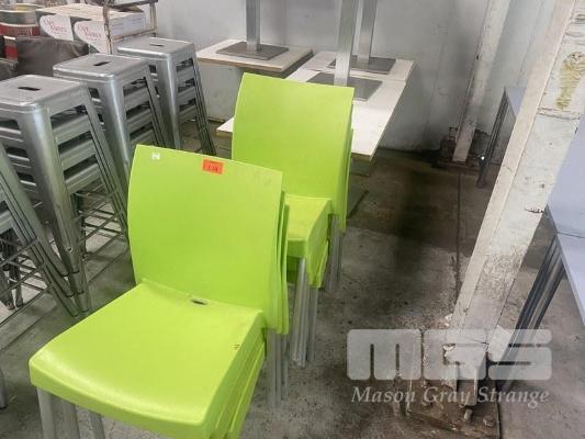 7 x CAFE TABLES, 70 x 60cm, LAMINATE TOP & 7 x LIME GREEN CHAIRS