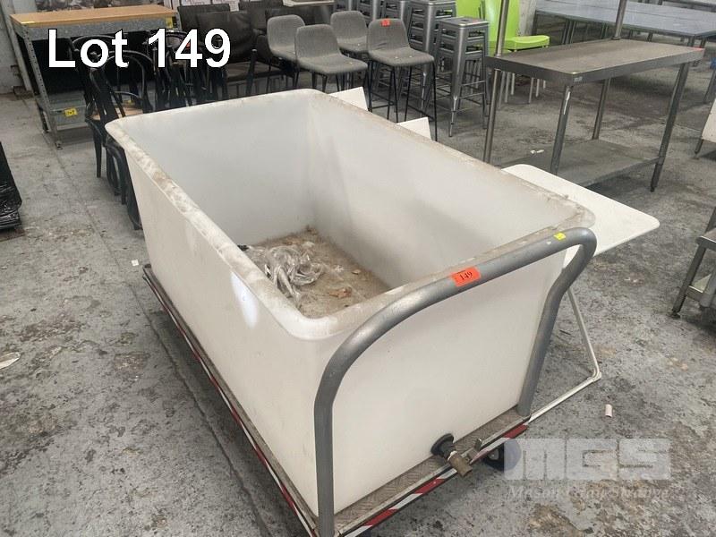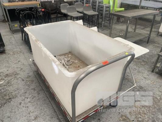 LARGE CAPACITY POLY TUB, 1500 x 900 x 650mm WITH DRAIN HOLE, MOUNTED ON ALLOY FLAT BED TROLLEY