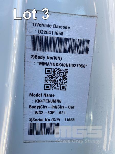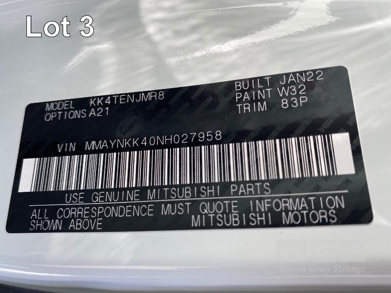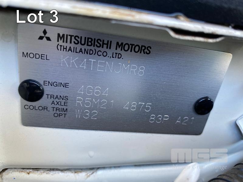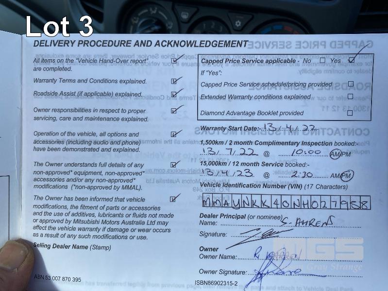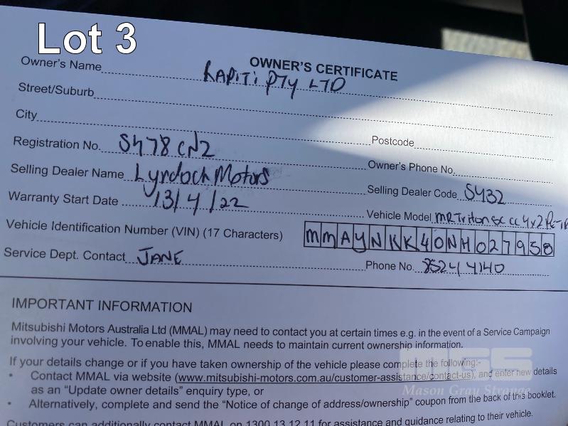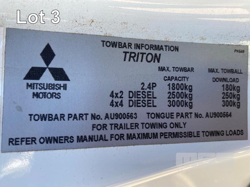 2022 MITSUBISHI TRITON MR, SINGLE CAB, TRAFFIC CONTROL T/TOP REG: S478 CNZ VIN: MMAYNKK40NH027958 ENG: 4G64UAK7757 ODO: 21,682ksm SHOWING 2.4LTR PETROL, 5 SPEED MANUAL TRANSMISSION, WHITE DUCO, 2 DOORS, 2 SEAT, ABS, AIR BAG, AIR CON, ALLOY TRAY, BLUETOOTH, CD PLAYER, CENTRAL LOCKING, CRUISE CONTROL, IMMOBILISER, POWER STEERING, POWER WINDOWS, SPARE WHEEL, TOW BAR, TRACTION CONTROL, WARNING LIGHTS, DUAL BATTERIES REVERSE CAMERA FITTED WITH TRAFFIC CONTROL ILLUMINATED ARROW SIGN POWER LIFT & REMOTE WITH ROAD SIGN CARRY RACK KEY #39 (WITH PAPERS, WITH 1 KEY/S, WITH OWNER'S MANUAL, WITH SERVICE BOOKS)