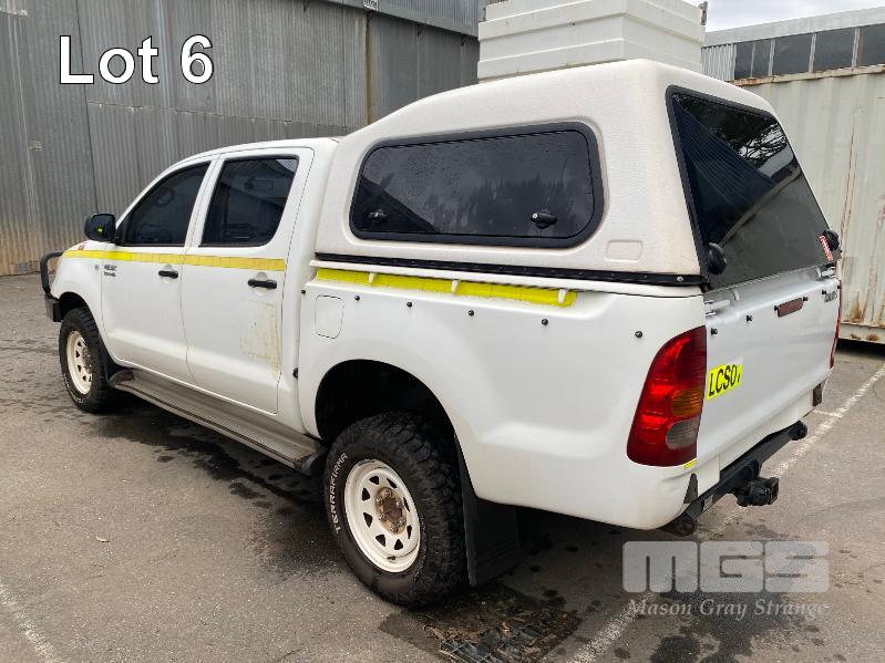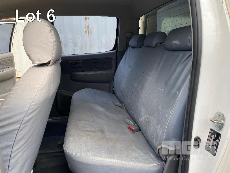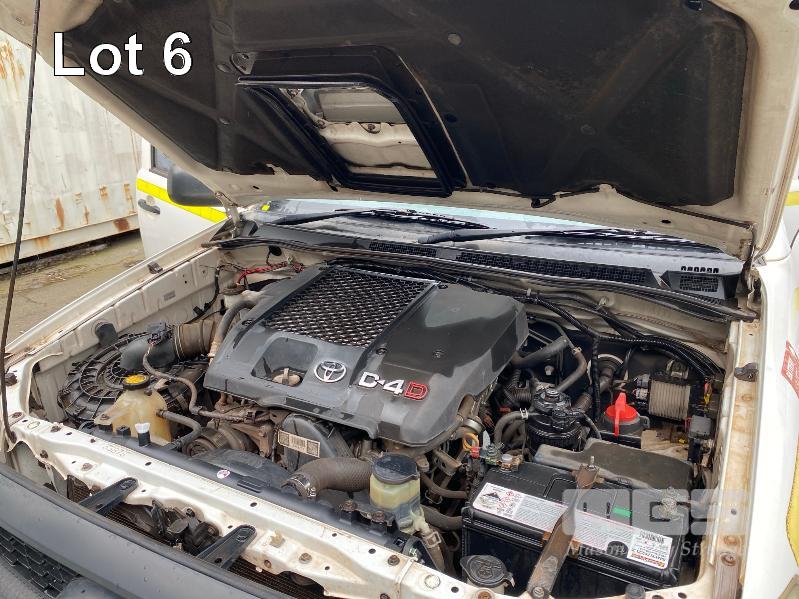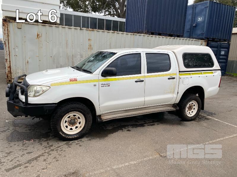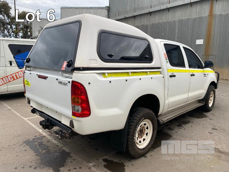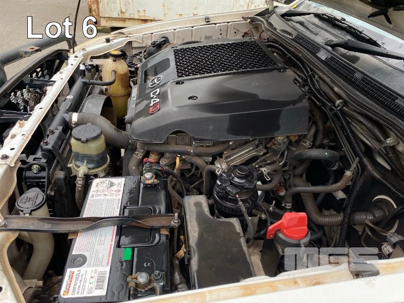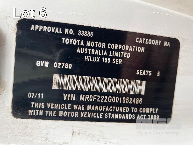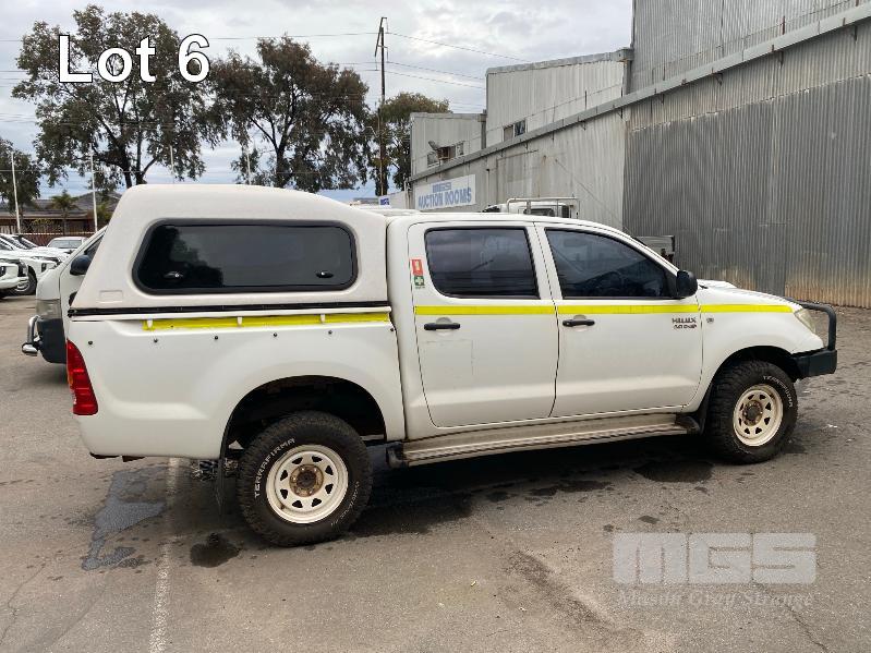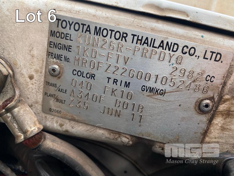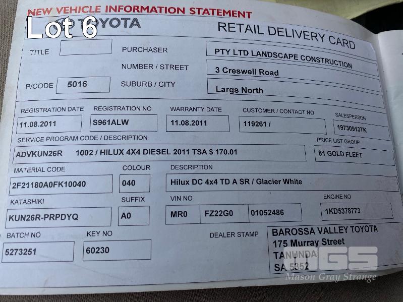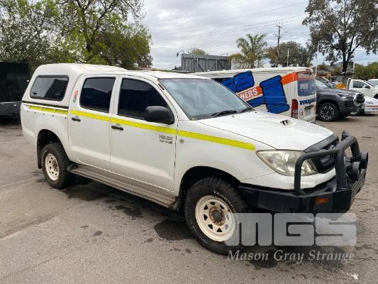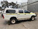 2011 TOYOTA HILUX KUN26R-PRPDYQ 150 SERIES DUAL CAB UTE 4x4 REG: NO PLATES VIN: MR0FZ22G001052486 ENG: 1KD5378773 ODO: 280,340kms SHOWING 3.0 LITRE TURBO DIESEL, AUTOMATIC TRANSMISSION, WHITE DUCO, 4 DOORS, 5 SEAT, 4x4 AIR BAG, AIR CON, BULL BAR, CD PLAYER, CENTRAL LOCKING, CRUISE CONTROL, DECALS, IMMOBILISER, POWER STEERING, POWER WINDOWS, SIDE STEP, SPARE WHEEL, SPOT LIGHTS, FLEXIGLASS CANOPY WITH 3 x GAS LIFT WINDOWS BATTERY ISOLATION SWITCH KEY #11 (WITH 4 KEY/S, WITH OWNER'S MANUAL, WITH SERVICE BOOKS)