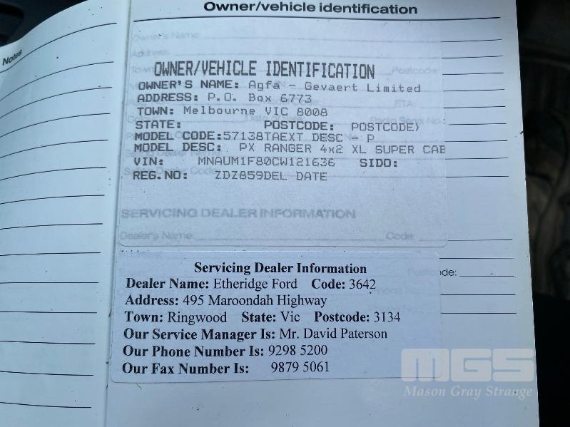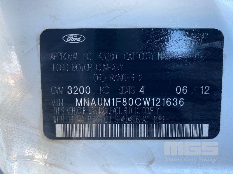 2012 FORD RANGER 2 SPACE CAB UTILITY REG: S889 CWI (SA) VIN: MNAUM1F80CW121636 ENG: P4AT1021554 ODO: 360,000kms SHOWING 2.2 LITRE TURBO DIESEL, AUTOMATIC TRANSMISSION, WHITE DUCO, 2 DOORS, 4 SEAT, ABS, AIR BAG, AIR CON, CENTRAL LOCKING, IMMOBILISER, POWER STEERING, SPARE WHEEL, FITTED WITH FIBREGLASS CANOPY, 3 x ACCESS WINDOWS WITH A SPARE SET RIMS & TYRES KEY #51 (WITH PAPERS, WITH 1 KEY/S, WITH OWNER'S MANUAL)