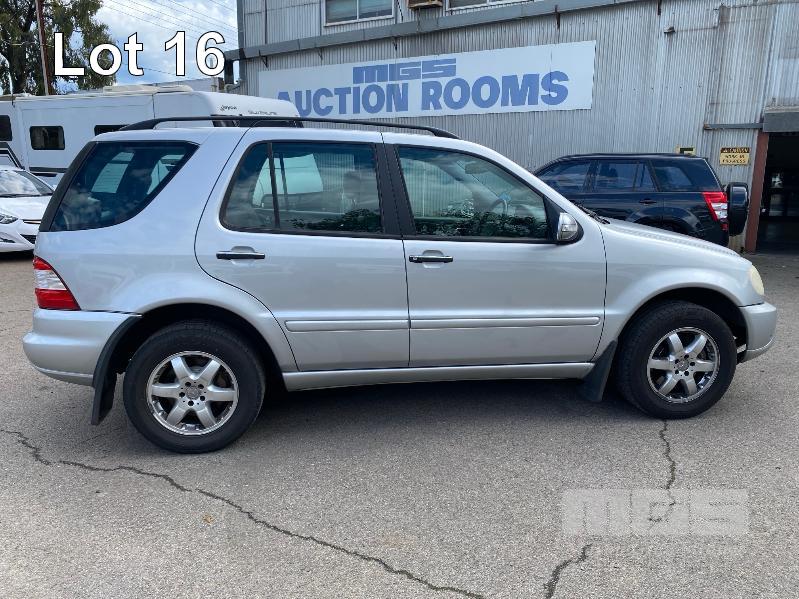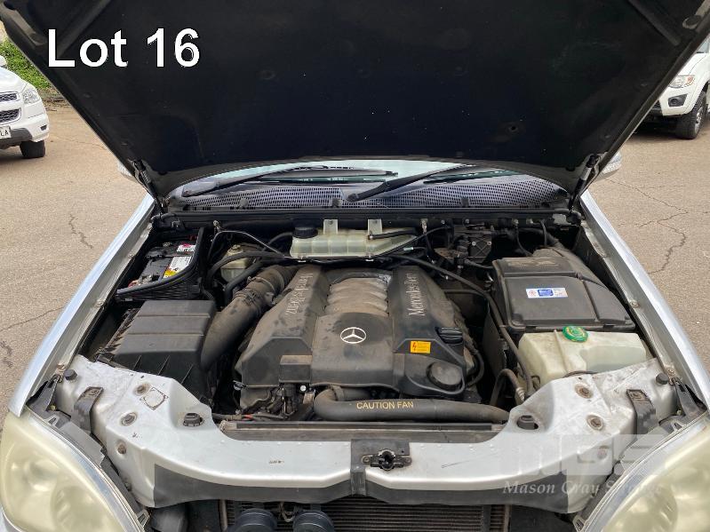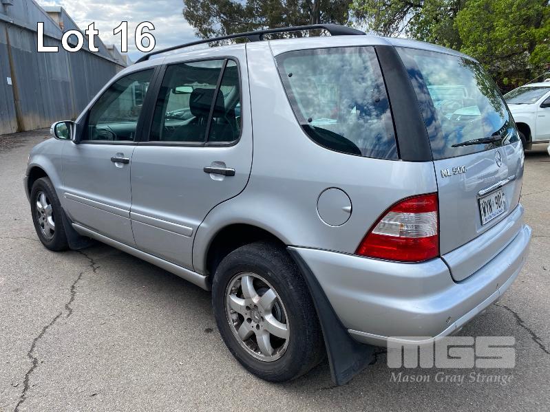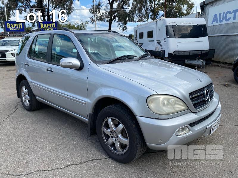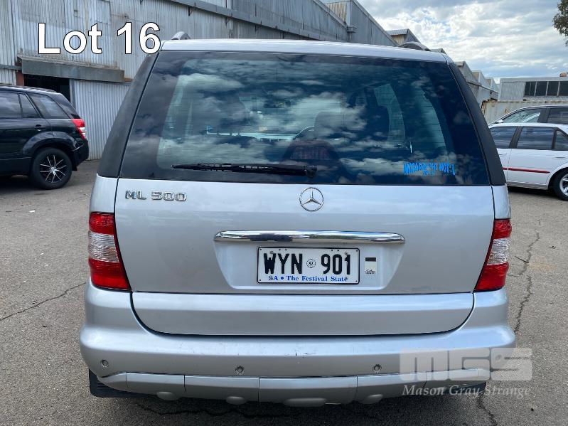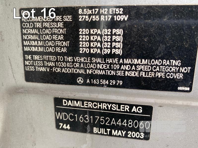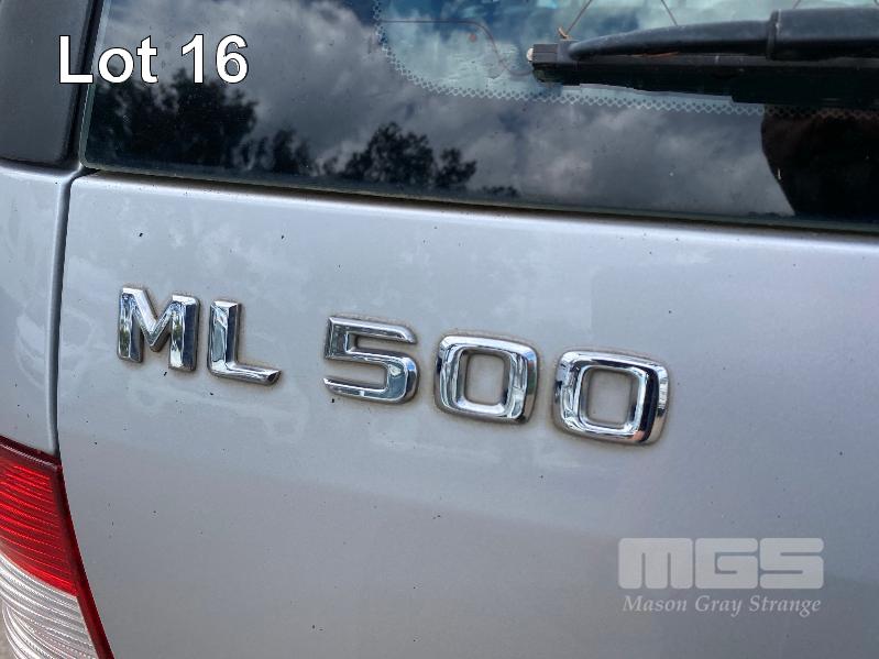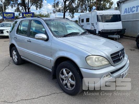 2003 MERCEDES BENZ ML500 SUV REG: WYN 901 (SA) VIN: WDC1631752A448060 ENG: 11396530493446 ODO: 185,296kms SHOWING 5.0 LITRE V8 PETROL, AUTOMATIC TRANSMISSION, SILVER DUCO, 4 DOORS, 5 SEAT, AWD AIR CON, ALLOY WHEELS, CD PLAYER, CENTRAL LOCKING, IMMOBILISER, POWER WINDOWS, SPARE WHEEL, SUNROOF, KEY #34 (WITH PAPERS, WITH 2 KEY/S, WITH OWNER'S MANUAL, WITH SERVICE BOOKS) CONDITION: ENGINE - ENGINE WARNING LIGHT IS ON