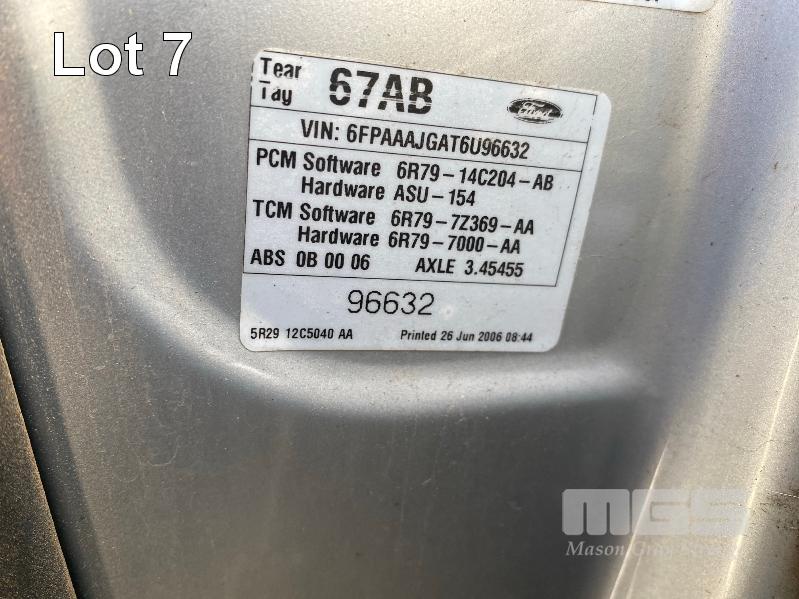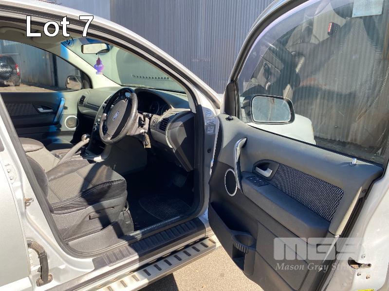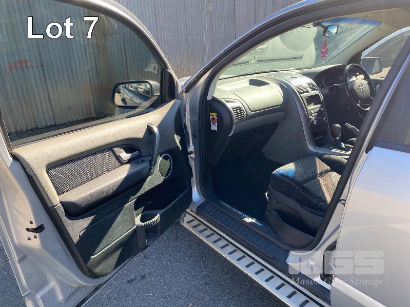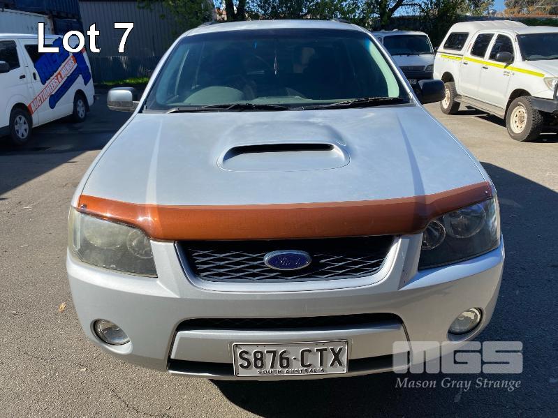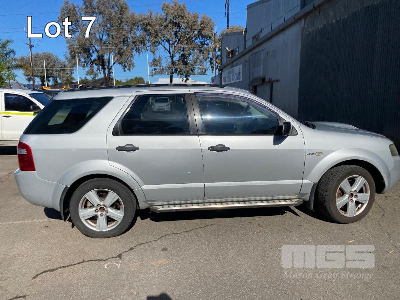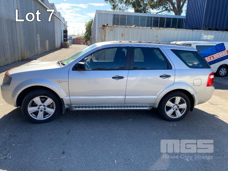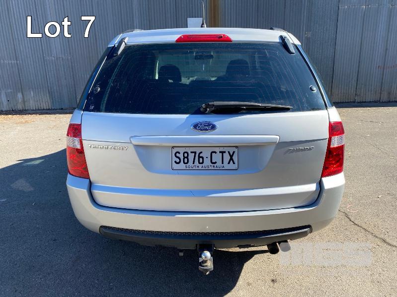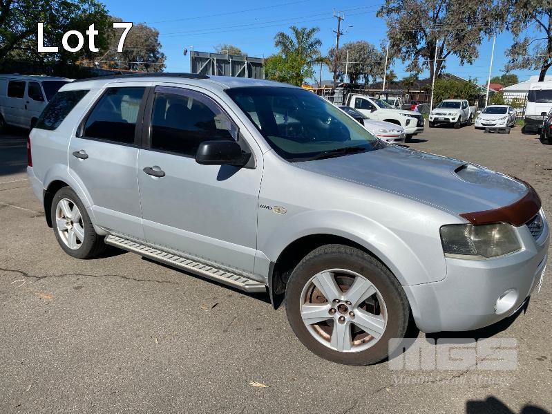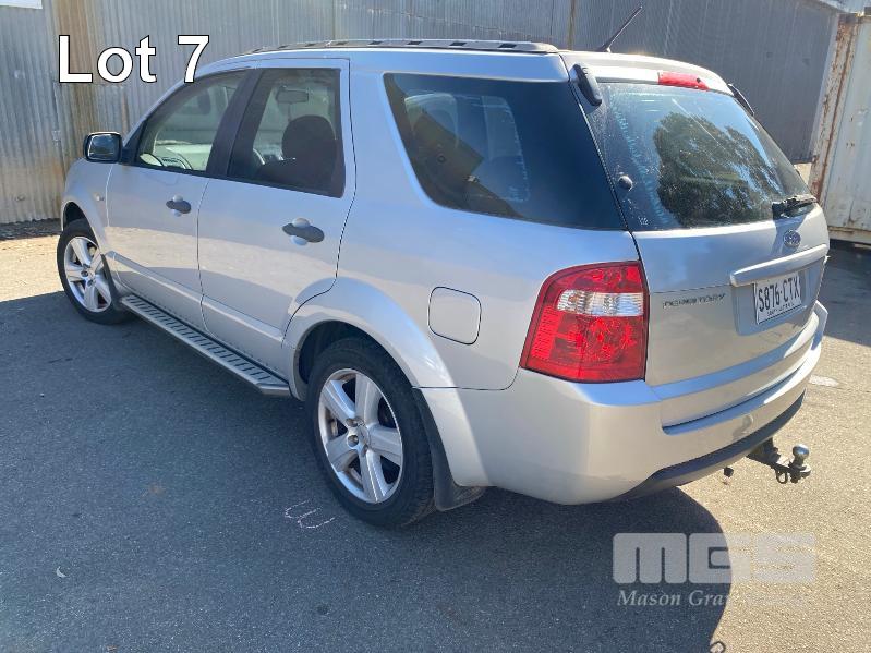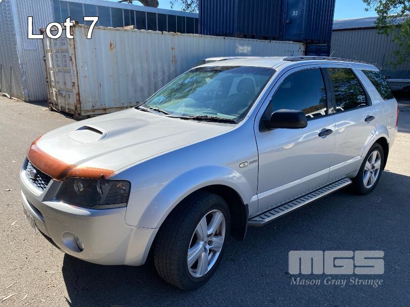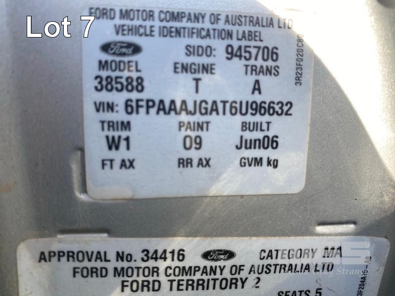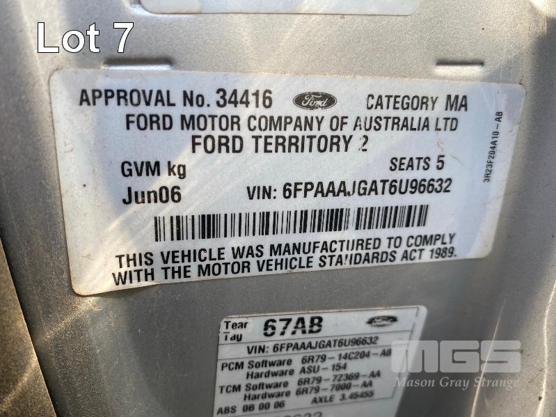 2006 FORD TERRITORY 2, SUV REG: S876 CTX (SA) VIN: 6FPAAAJGAT6U96632 ENG: JGAT6U96632 ODO: 242,140kms SHOWING 4 LITRE TURBO PETROL, SILVER DUCO, 4 DOORS, 5 SEAT, AWD AIR BAG, AIR CON, ALLOY WHEELS, CD PLAYER, CENTRAL LOCKING, CRUISE CONTROL, IMMOBILISER, POWER STEERING, POWER WINDOWS, SIDE STEP, SPARE WHEEL, TOW BAR KEY #53 (WITH PAPERS, WITH 2 KEY/S) CONDITION: DUCO - OXIDISED/FADED
