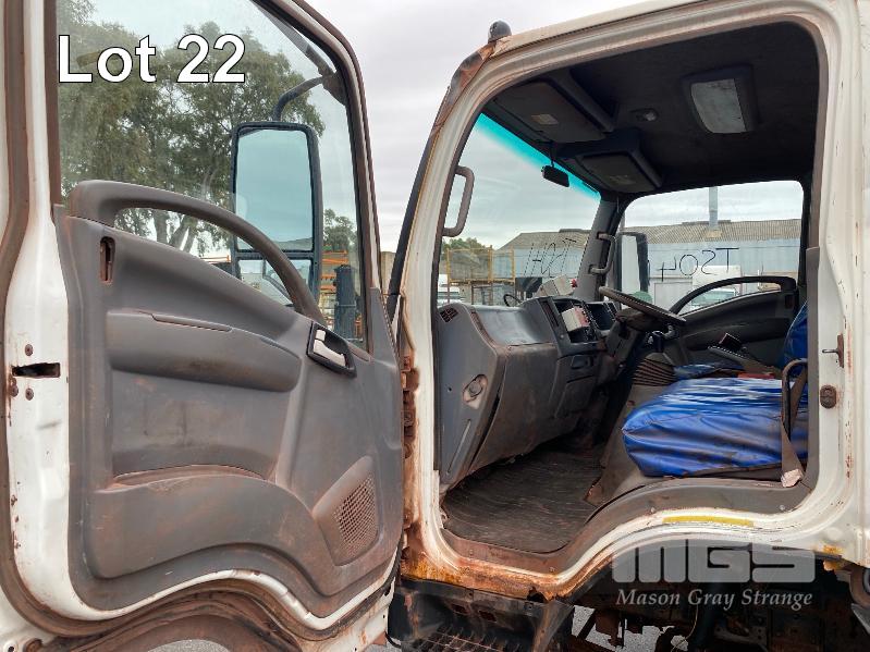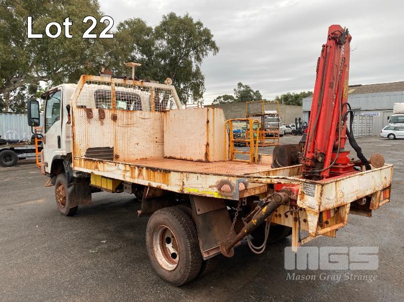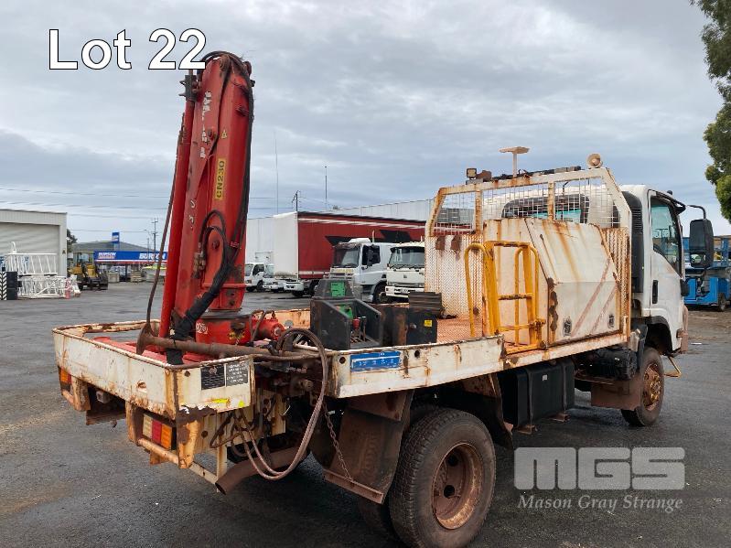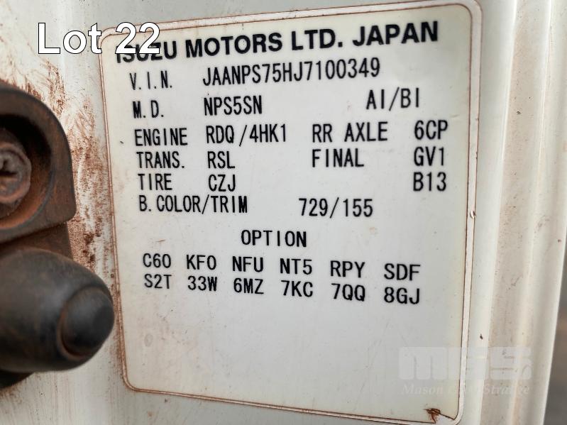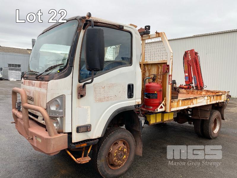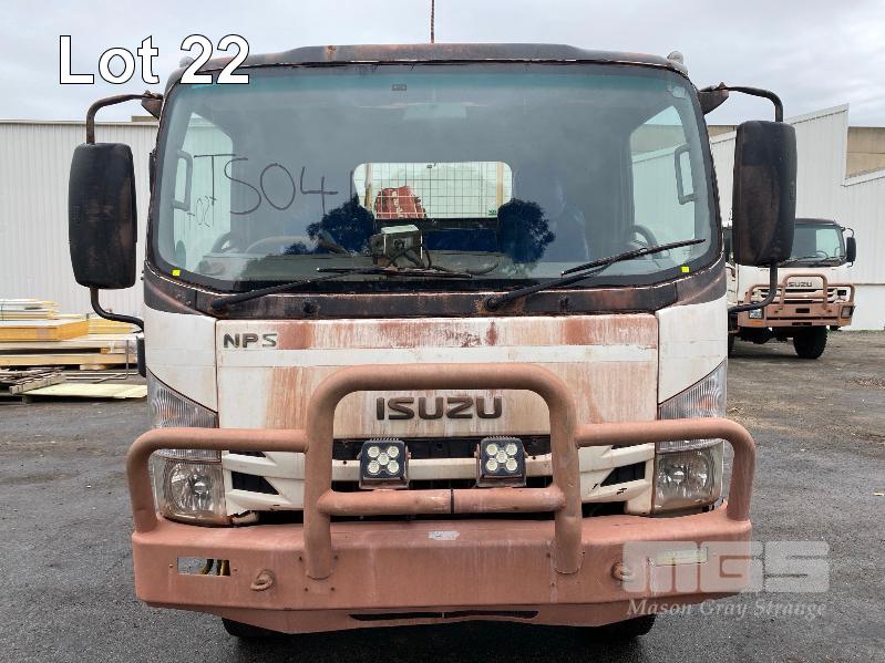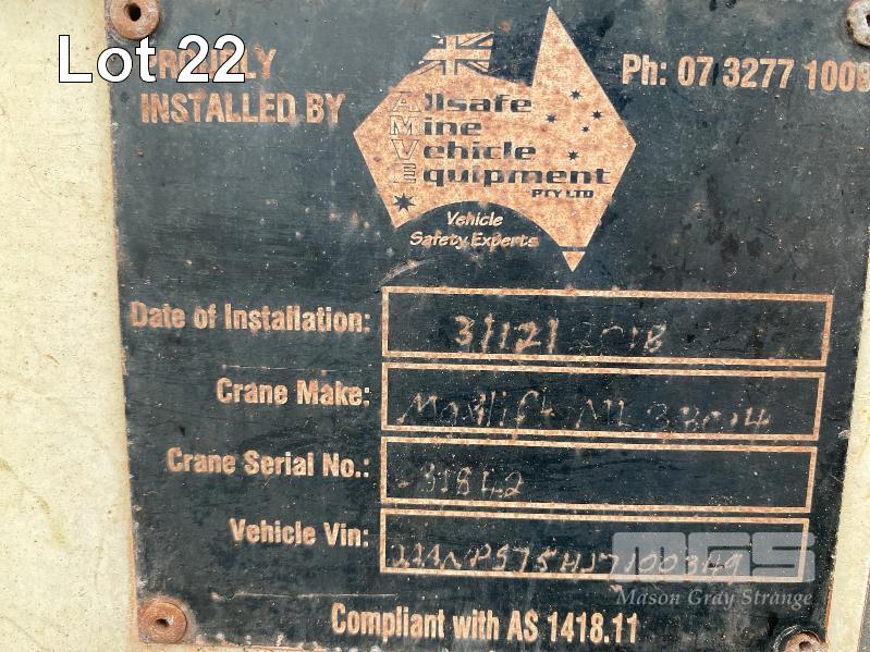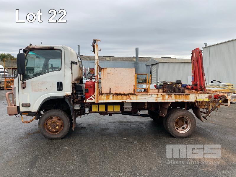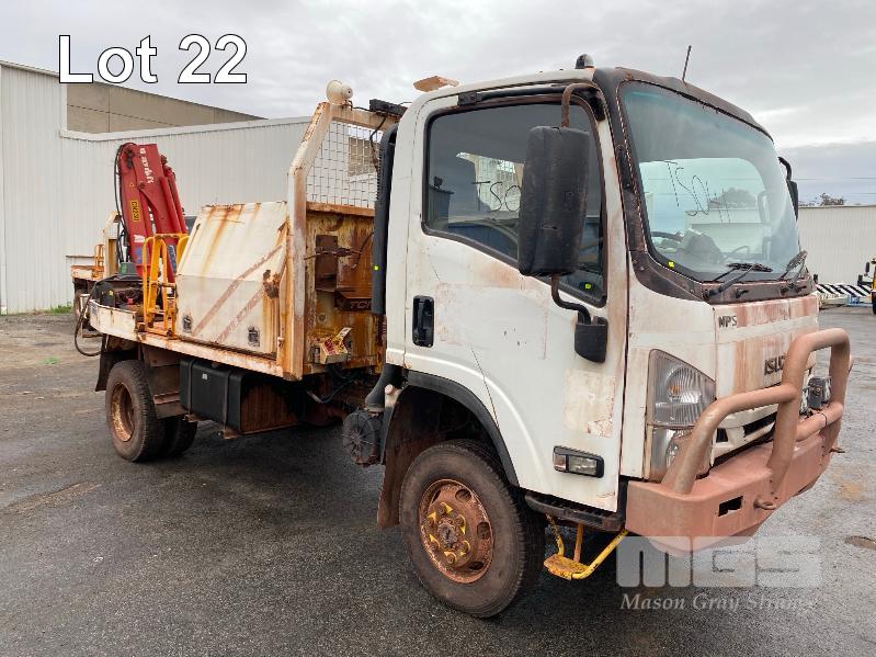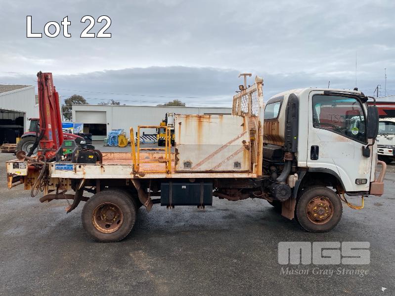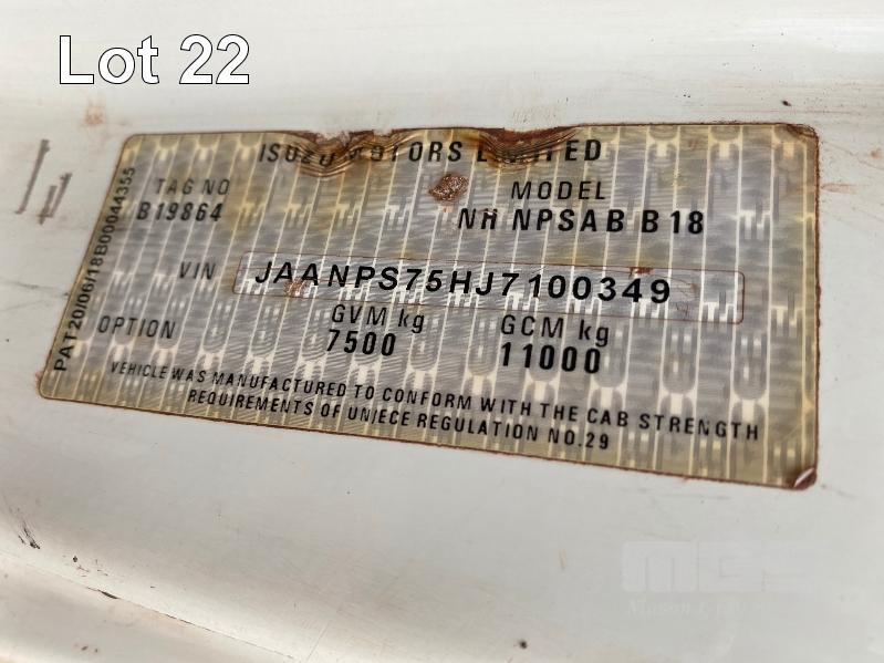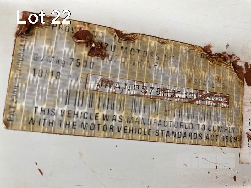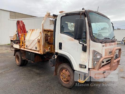 2018 ISUZU NH-NPSABB18, 4x4, SINGLE CAB, TRAY TOP, CRANE TRUCK REG: NO PLATES VIN: JAANPS75HJ7100349 ODO: 63,327kms SHOWING GVM: 7,500kg GCM: 11,000kg 5.2 LITRE TURBO DIESEL, 5 SPEED MANUAL TRANSMISSION, SPRING SUSPENSION, WHITE DUCO, 8.5R17.5 2 DOORS, 3 SEAT, AIR CON, BULL BAR, STEEL RIMS, REAR MOUNT CRANE MAXILIFT MOD: ML33014 2.2 TONNE MAX CAP. 5.3mtrs MAX REACH 2 x OUTRIGGERS MINE SPEC FIRE SUPPRESSION SYSTEM TRAY MOUNT STORAGE CABINET LADDER ACCESS TO TRAY BATTERY ISOLATION SWITCHES TRAY SIZE 3150 x 2200mm KEY #23 (WITH 1 KEY/S) CONDITION: BODY - VERY RUSTY, SOME HOLES
