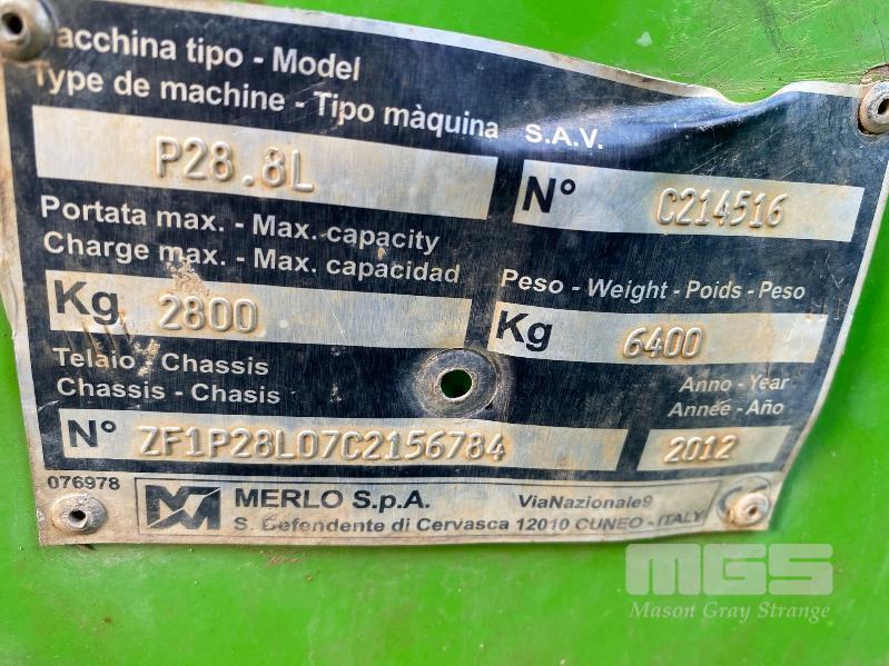 2012 MERLO S.P.A TELEHANDLER, TWIN STEER, 4x4 MOD: P28.8L S/NO: ZF1P28L07C2156784 REG: S04 SKV (SA) MAX LIFT CAP: 2,800kg MAX REACH: 8,000mm POWERED BY PERKINS 74kw DIESEL ENGINE TYPE: 3066/2300 HOURS: 5,824 SHOWING FITTED WITH FORK ATTACHMENT DIGITAL LOAD SCALES BATTERY ISOLATION SWITCH EMERGENCY STOP SWITCHES ROPS & FOPS REVERSE CAMERA WITH INSPECTION BOOKS KEY #25
