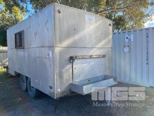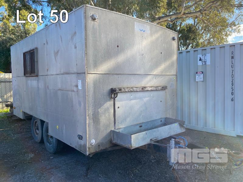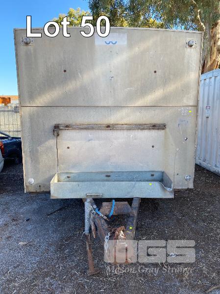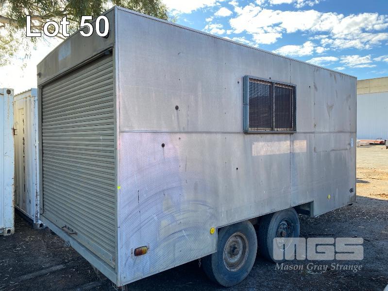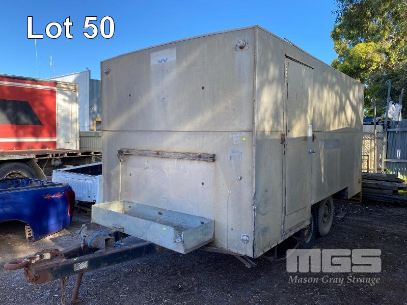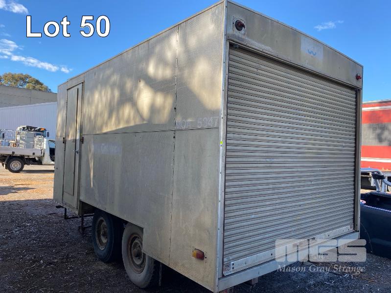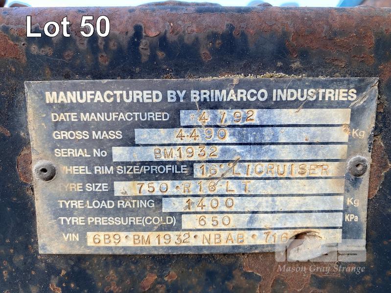 1992 BRIMARCO IND. ENCLOSED TRAILER/CARAVAN, TANDEM AXLE, MOBILE WORKSHOP/STORAGE REG: TDC 522 (SA) VIN: 6B9BM192NBAB7167 SIZE : 4410 x 2410 x 2670mm (H) FULLY ENCLOSED ALLOY CLAD BODY WITH REAR ROLLER DOOR, 1 x WINDOW & ROOF MOUNT POP UP VENT, BUILT IN SHELVING & RACKING, WORK BENCH & SEATING RING FEEDER HITCH, AIR BRAKES TYRE SIZE: 7.50R16LT GVM: 4,490kg