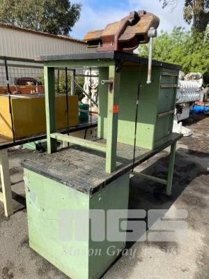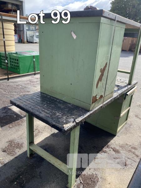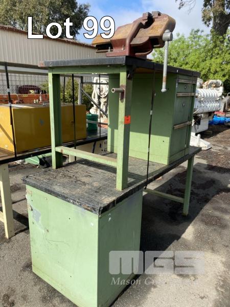 2 x STEEL WORK BENCHES, 2000 x 700 x 900mm (H) WITH DAWN OFFSET VICE, 150mm & 2 x METAL CABINETS, 3 DRAWER