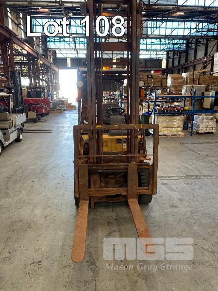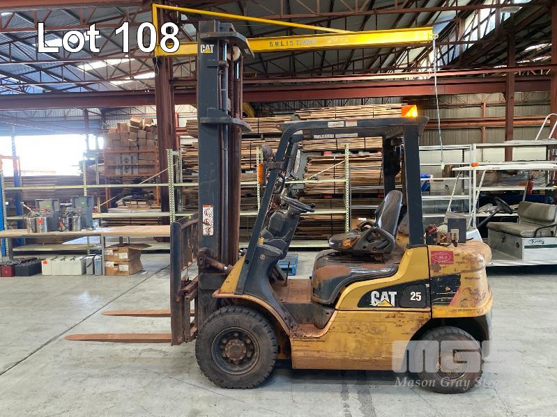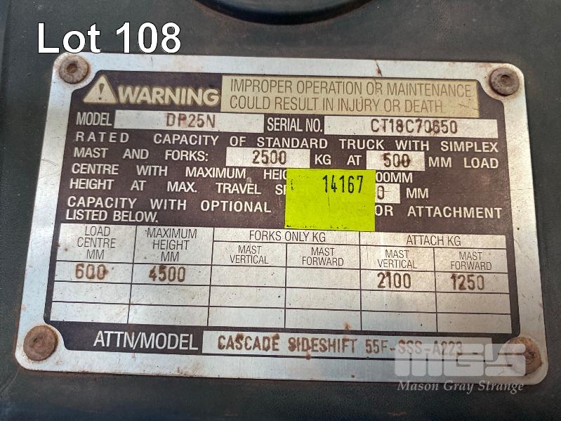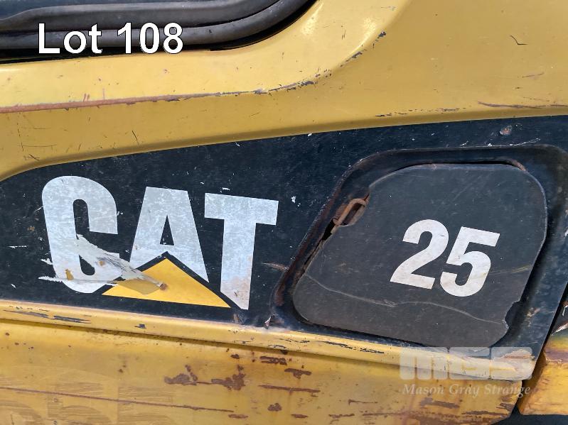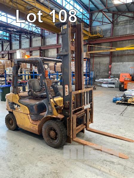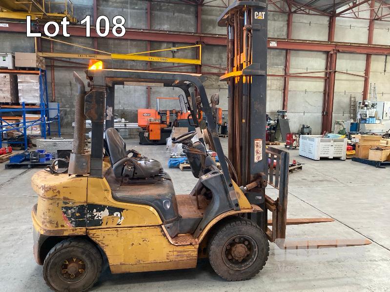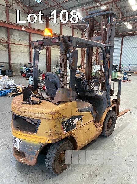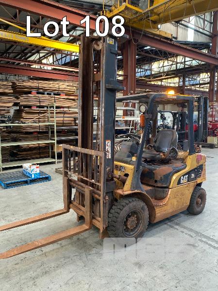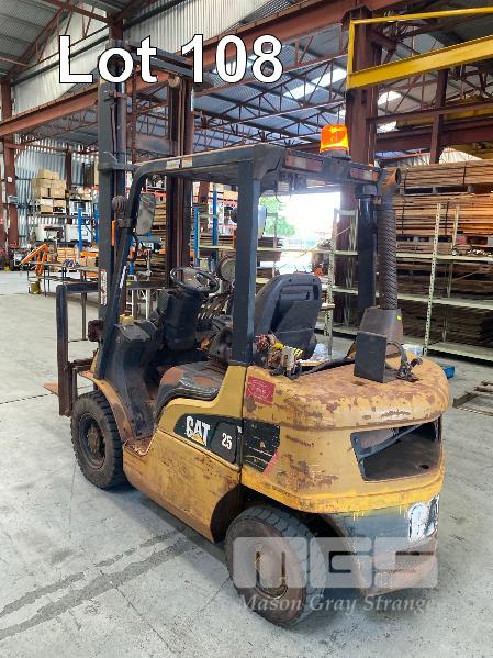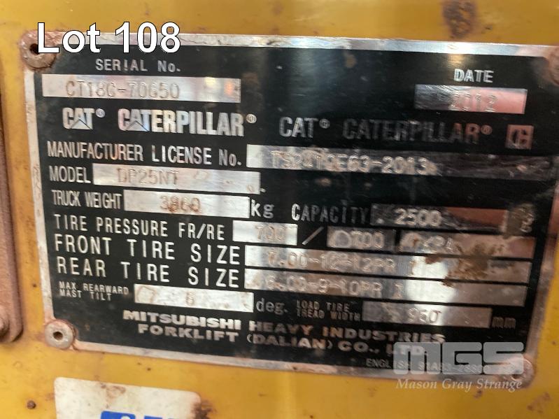 2012 CATERPILLAR FORKLIFT, 2.5 TONNE MOD: DP25NT S/NO: CT18C-70650 4 CYLINDER DIESEL ENGINE HOURS: 1,248 SHOWING CAPACITY RATED TO 2,100kg @ 600mm LOAD CENTRE MAX LIFT HEIGHT: 4,500mm 2 STAGE MAST, SIDE SHIFT DIAL WEIGHT SCALE BATTERY ISOLATION SWITCHES, EMERGENCY STOP SWITCH, PNEUMATIC TYRES 1 x KEY
