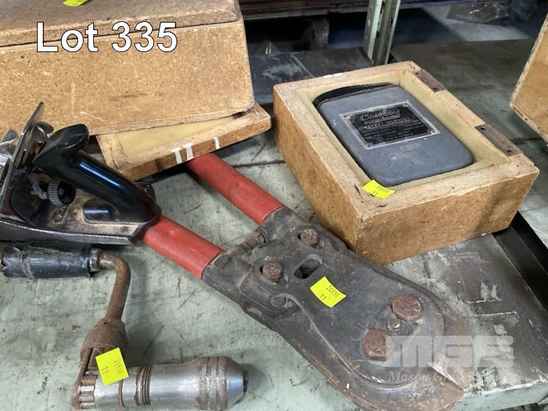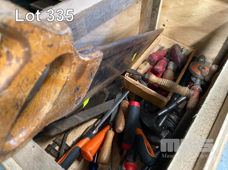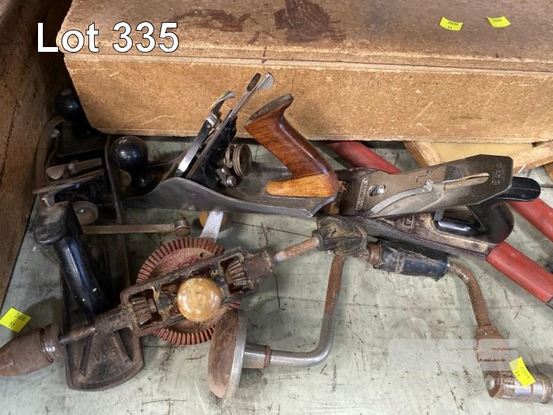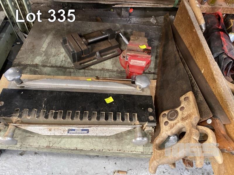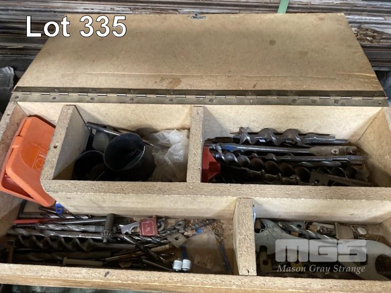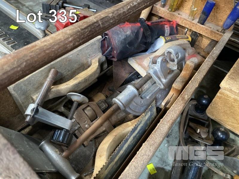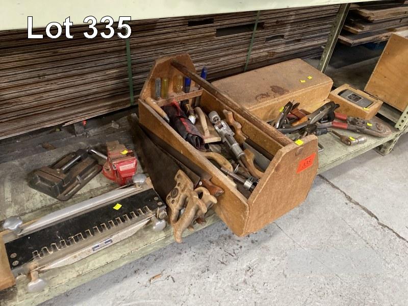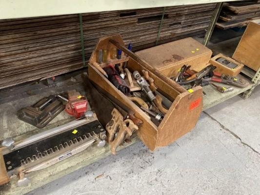 CARPENTERS BOX, WOOD PLANES, HAND SAW, BOLT CUTTERS, HAND DRILLS, WOOD CHISELS, PIPE CUTTER, VICE,1 x BOX DRILL BITS, 1 x BOX WOOD CHISELS, HAMMERS, FILES, SHER, 7 1/2", ELECTRIC SAW, 240V