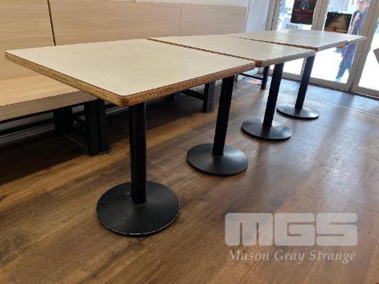 4 x CAFE TABLES, TIMBER LAMINATE, 700 x 700mm, BLACK PEDESTAL BASE & 3 x CAFE BENCH SEATS, 1220mm (L), TIMBER LAMINATE, BLACK STEEL BASE