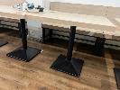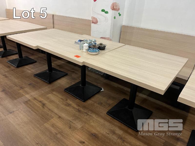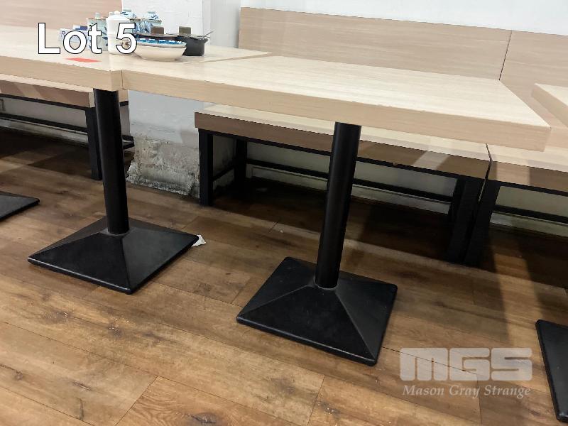 3 x CAFE TABLES, TIMBER LAMINATE, 800 x 900mm, BLACK PEDESTAL BASE WITH 2 x CAFE BENCH SEATS, TIMBER LAMINATE, 1200mm (L)