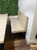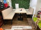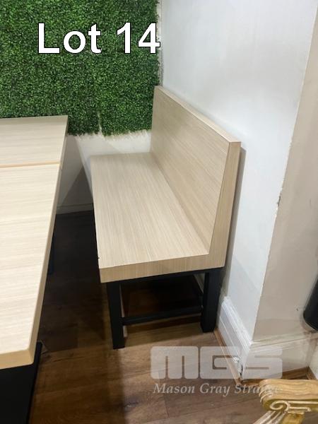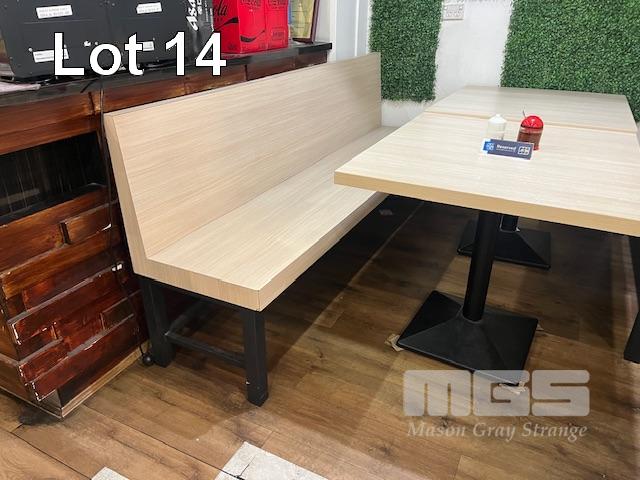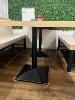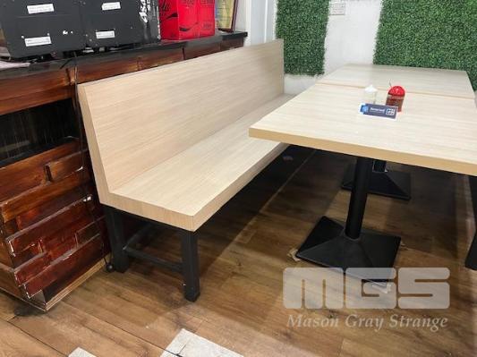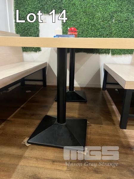 2 x CAFE TABLES, TIMBER LAMINATE, BLACK PEDESTAL BASE WITH 2 x CAFE BENCH SEATS, TIMBER LAMINATE, BLACK STEEL BASE,1200 & 2100mm