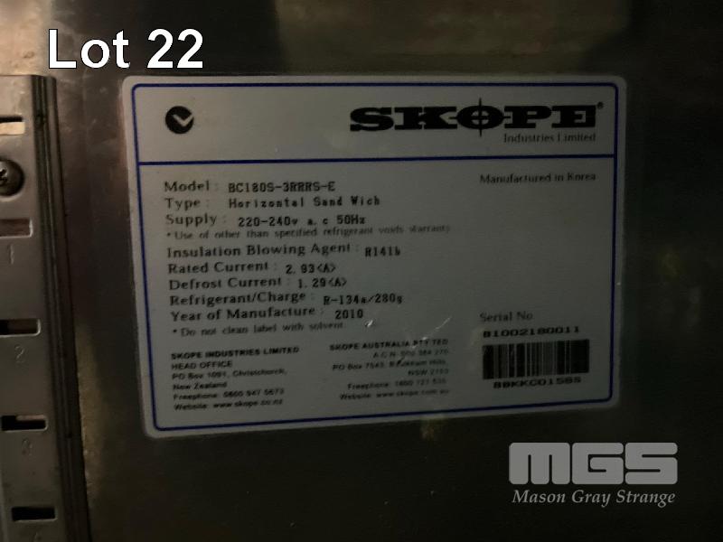SANDWICH PREP FRIDGE, SKOPE CENTAUR MOD: BC180S-3RRRS-E DOM: 2010 2 DOOR, PREP AREA: 1800 x 760mm 240V WITH CONTENTS