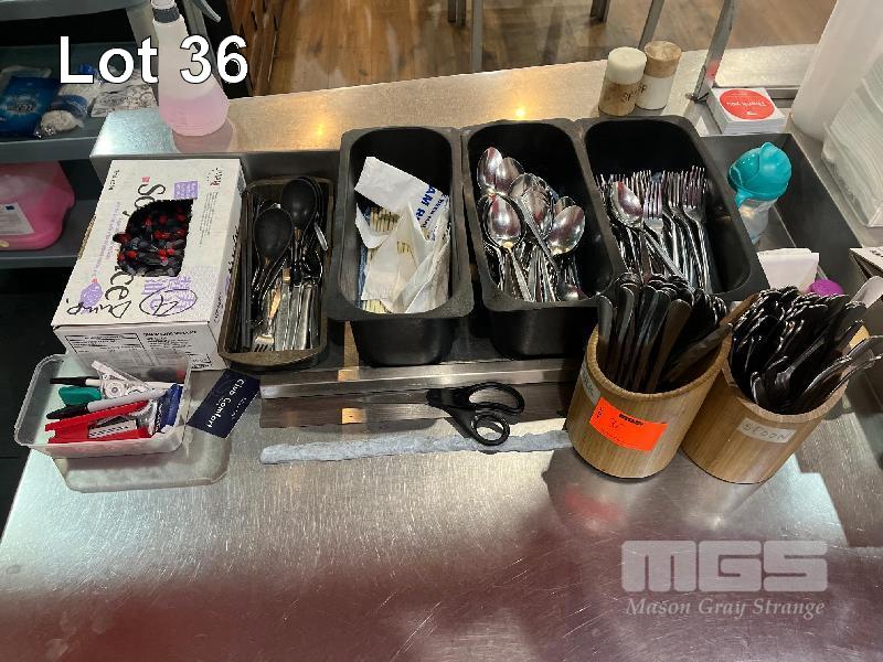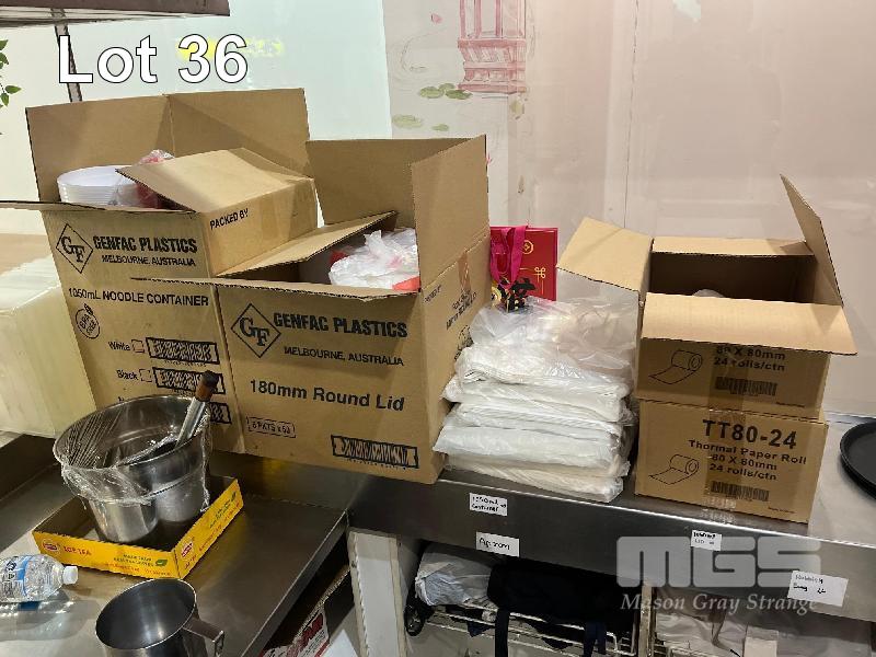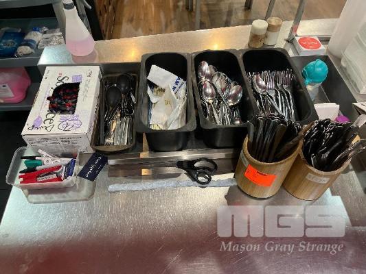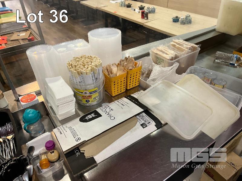 LARGE QUANTITY CUTLERY, SPOONS, FORKS, LADLES, DISPOSABLE CUTLERY, SPOONS, FORKS, CHOPSTICKS, TAKEAWAY CONTAINERS, BOWLS, TUBS & PLASTIC BAGS