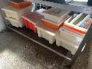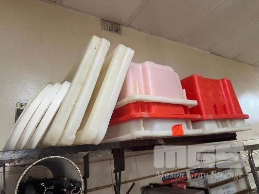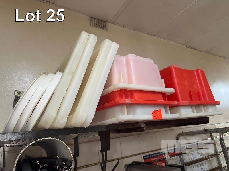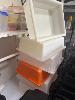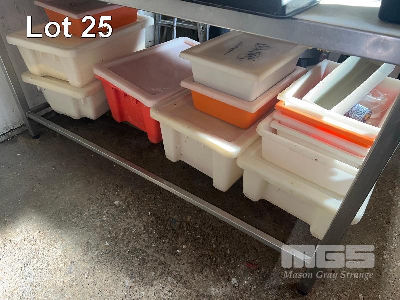 10 x LARGE & 12 x SMALL PVC TUBS, MOST WITH LIDS, WHITE/ORANGE (ON WALL & UNDER BENCH)