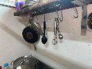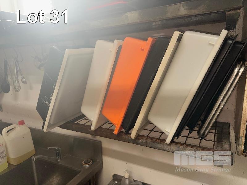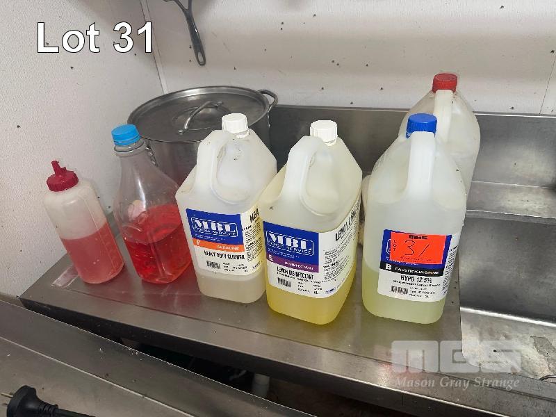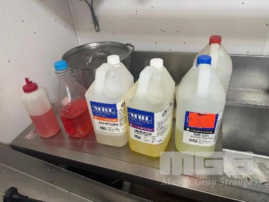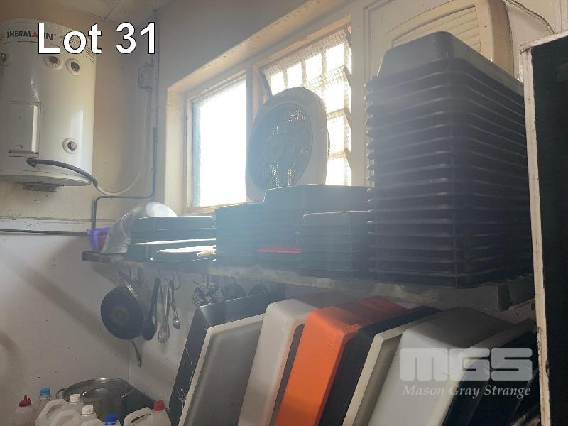 ASSORTED CLEANING AGENTS, UTENSILS, COOK POT, PVC TRAYS, ETC (ON WALL & SINK)