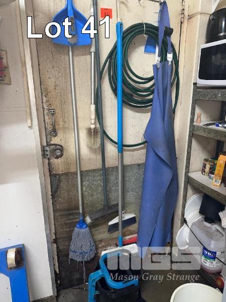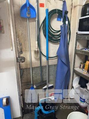 ASSORTED CLEANING EQUIPMENT,BROOM, MOP, SCRAPERS, HOSE, APRON, ETC