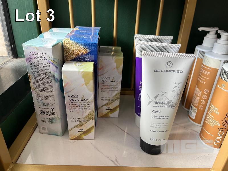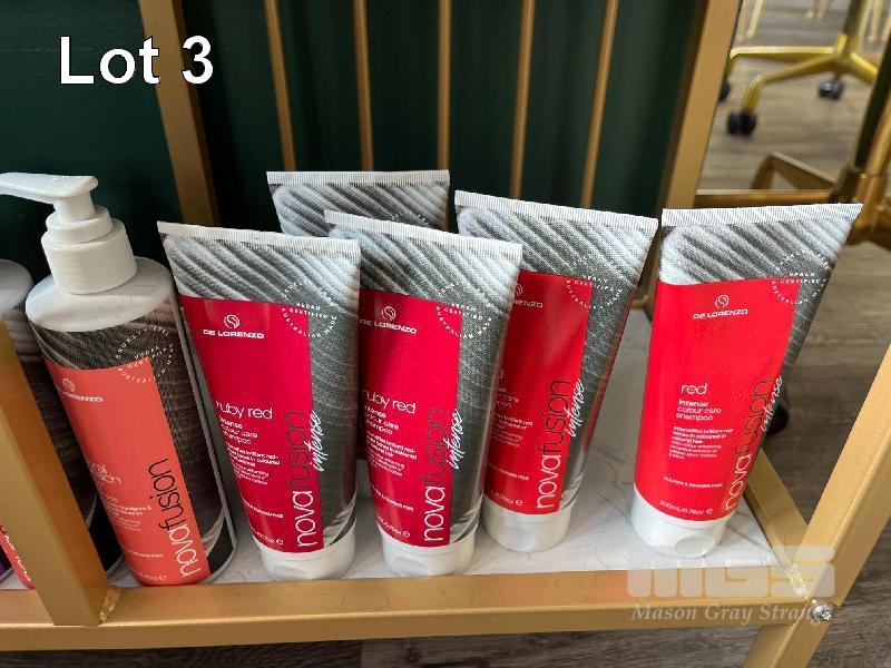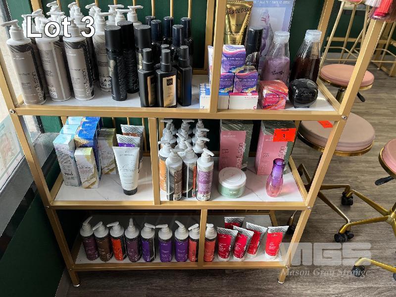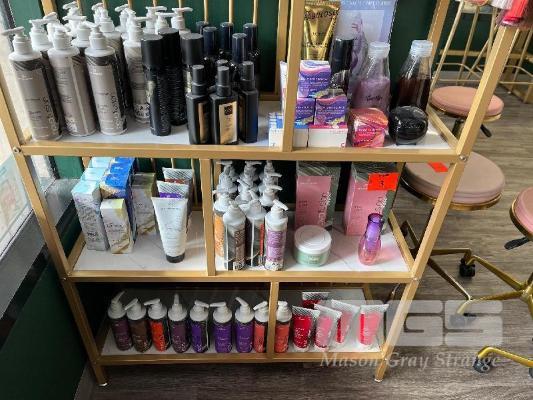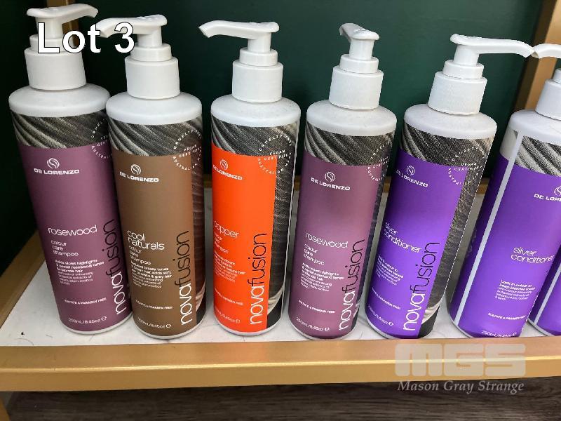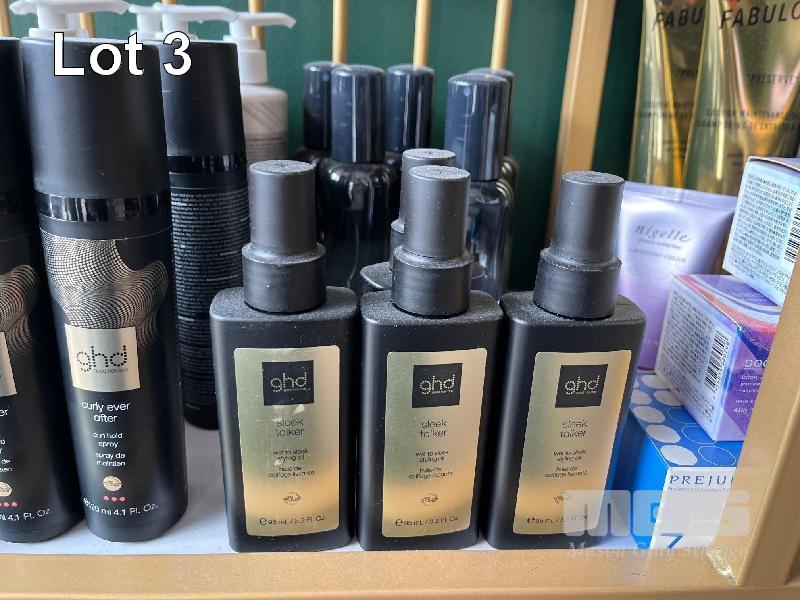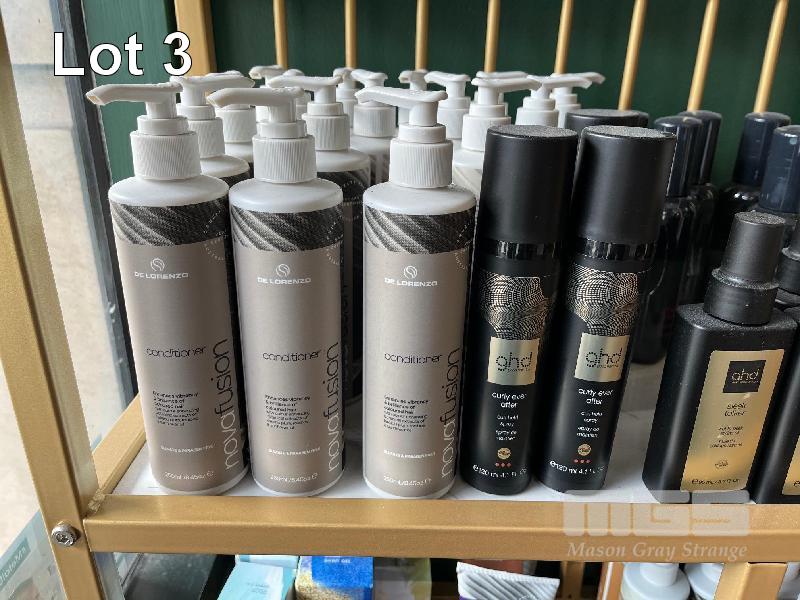 CONTENTS OF 3 SHELVES, LARGE QUANTITY ASSORTED HAIR PRODUCT, BRANDS INCLUDING: DE LORENZO, GHD, EVO FABULOSO, DOOR & KERASTASE ETC.