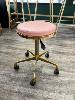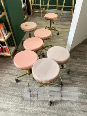 7 x SMALL GAS LIFT MOBILE STOOLS, GOLD STEEL FRAME, PINK VINYL TOP