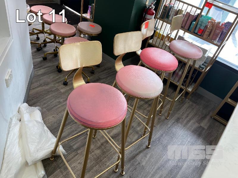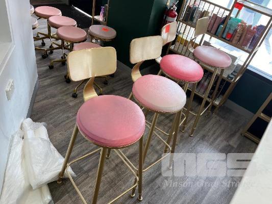 4 x BAR STOOLS, GOLD STEEL FRAME, PINK VINYL TOPS