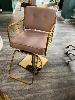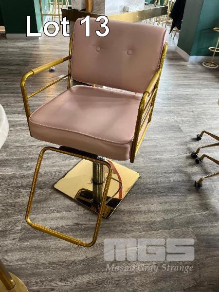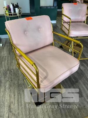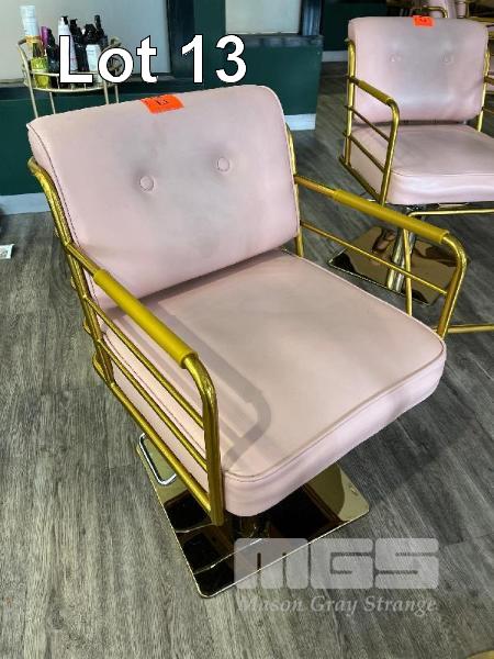 2 x GAS LIFT SALON CHAIRS, GOLD STEEL FRAME, PINK VINYL