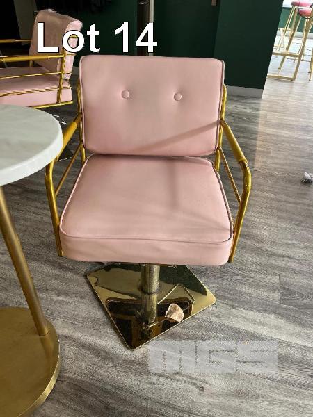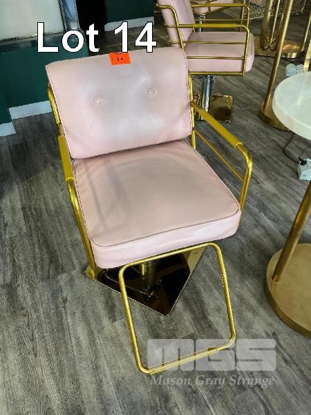 2 x GAS LIFT SALON CHAIRS, GOLD STEEL FRAME, PINK VINYL