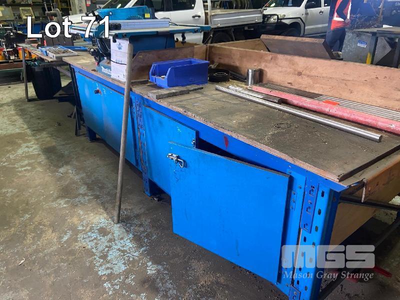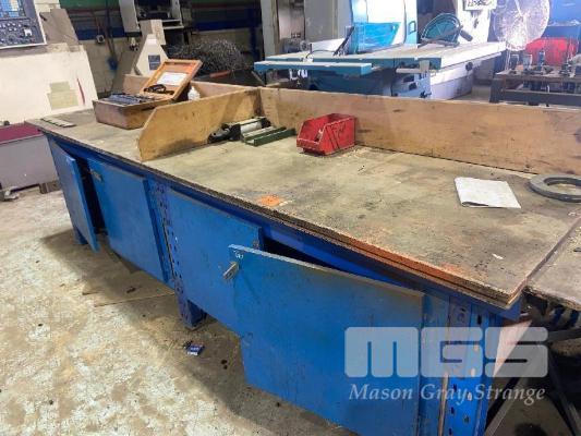 4 POSITION BENCH, 3100 (L) x 1400mm (W), DOUBLE SIDED, PLYWOOD TOP, 8 DOORS