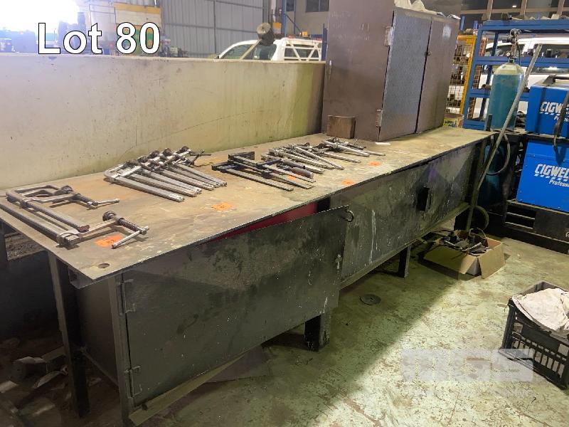 STEEL BENCH, 3320 x 920mm, PLATE TOP, 3 DOOR WITH 2 DOOR STOCK CUPBOARD