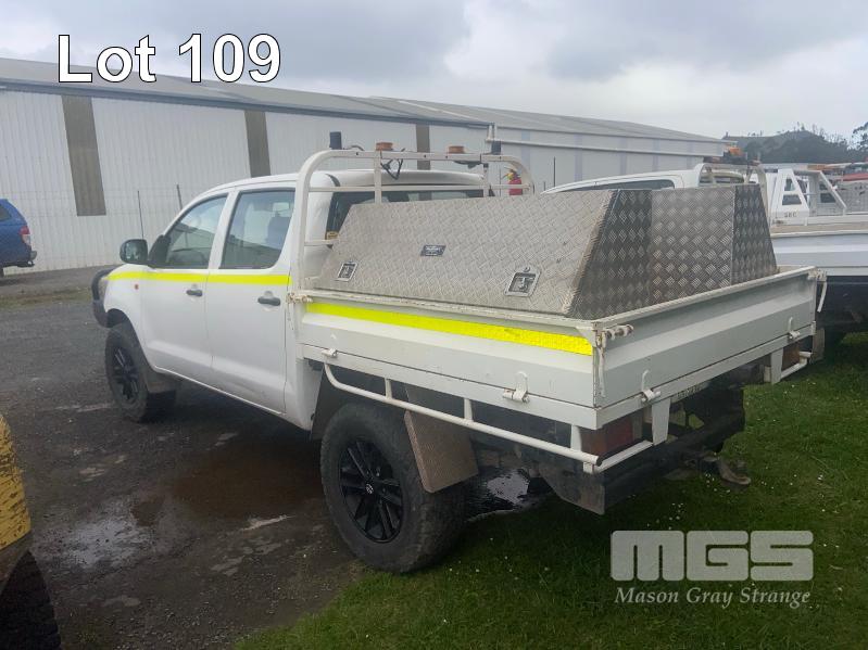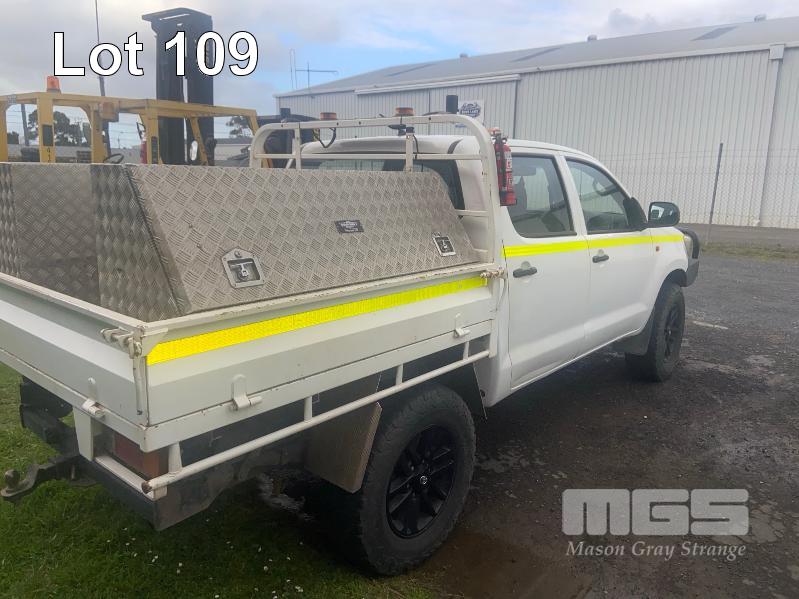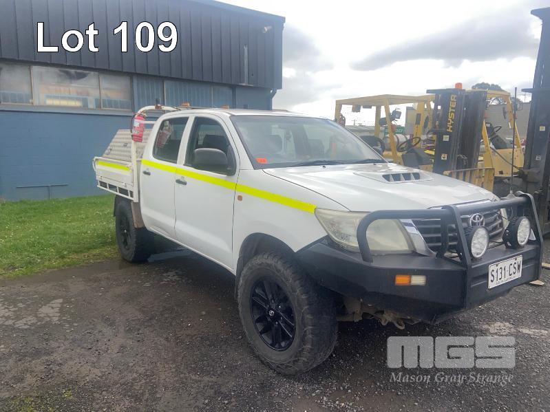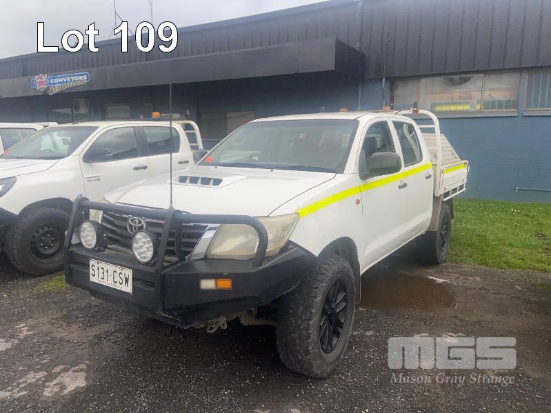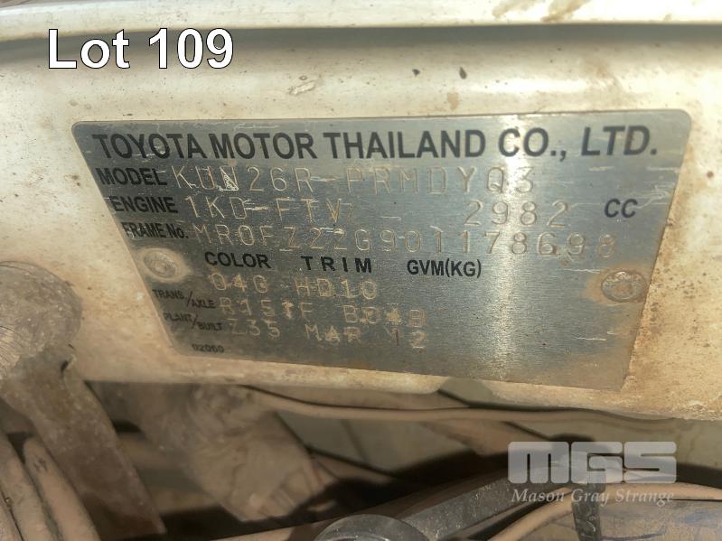2012 TOYOTA HILUX KUN26R-PRMDYQ3 DUEL CAB UTE 4X4 REG: S131 CSW (SA) VIN: MROFZ22G901178698 ODO: 351,658km 4CYL 2.8L, MANUAL, TURBO DIESEL, WHITE, 4 DOORS, 5 SEAT, 4W4 NOTE: DOES NOT INCLUDE TOOL BOXES (NO PAPERS, WITH 1 KEY/S, NO OWNER'S MANUAL, NO SERVICE BOOKS)