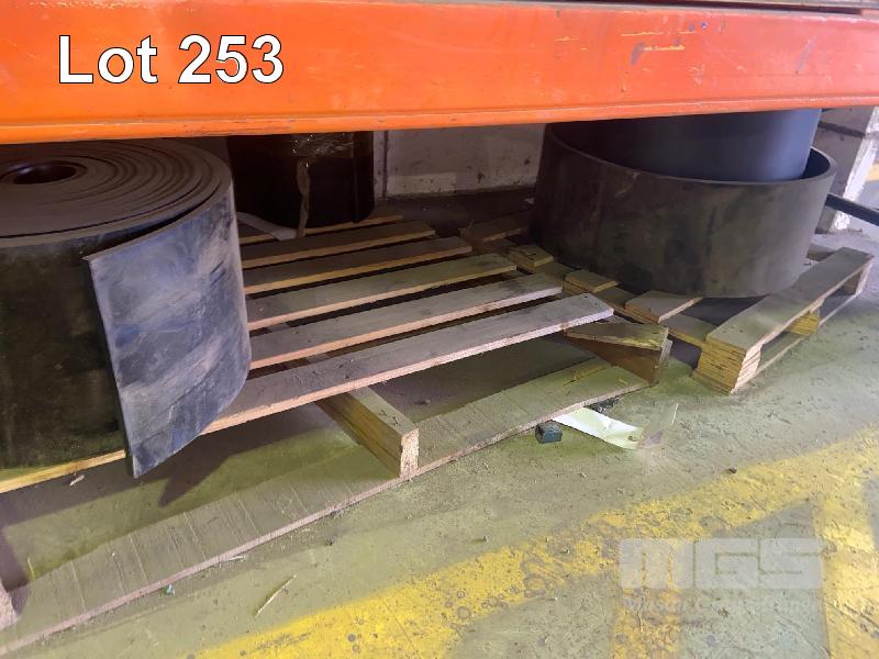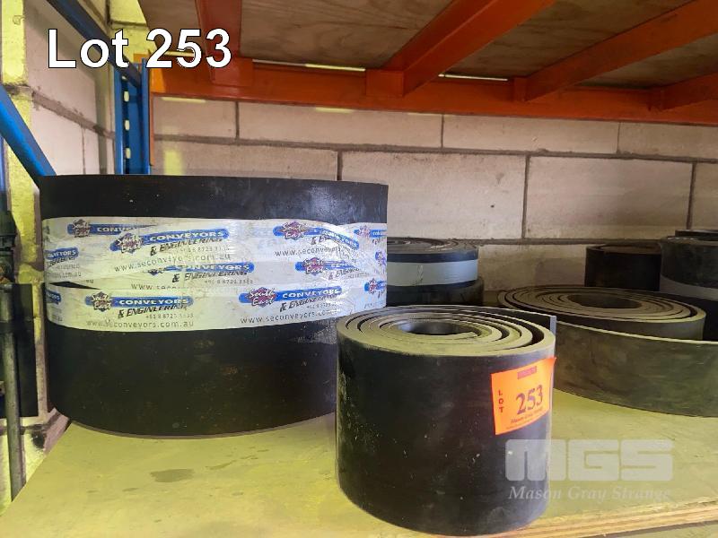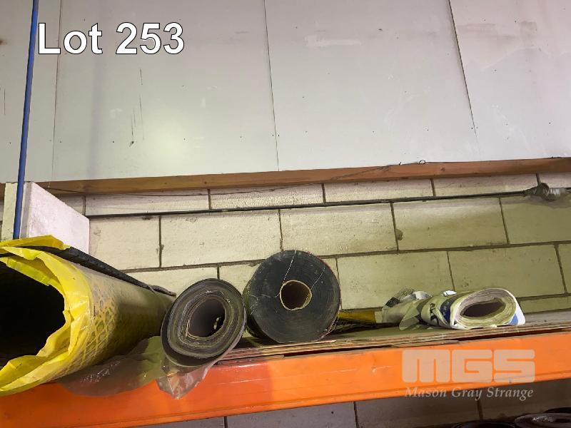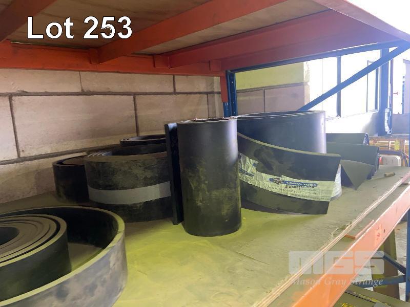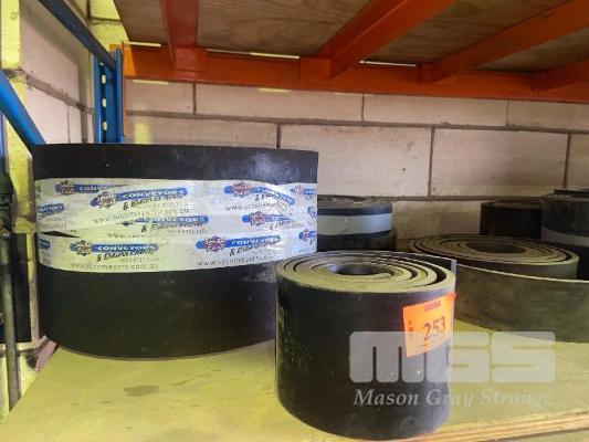 ASSORTED BELT OFFCUTS & RUBBER ROLLS, 100-1500mm, DUST CLOTH, ETC 2 x SHELVES & FLOOR