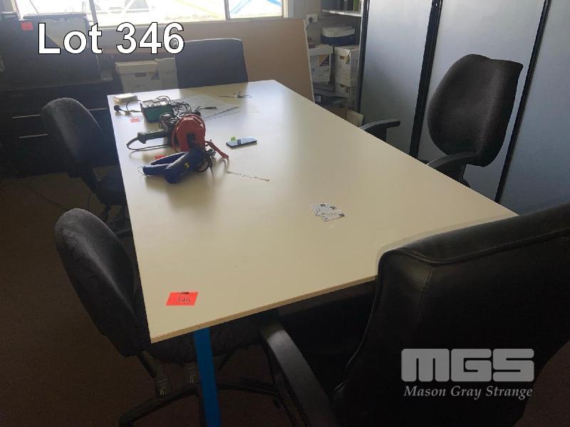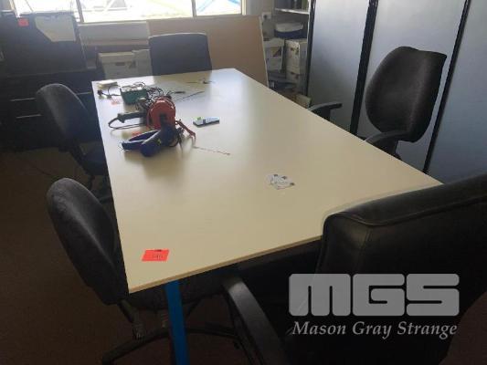 OFFICE MEETING TABLE, 2400 x 1200mm, 50mm TUBE, 5 x GAS LIFT CHAIRS & FILING CABINET, 4 DRAWER