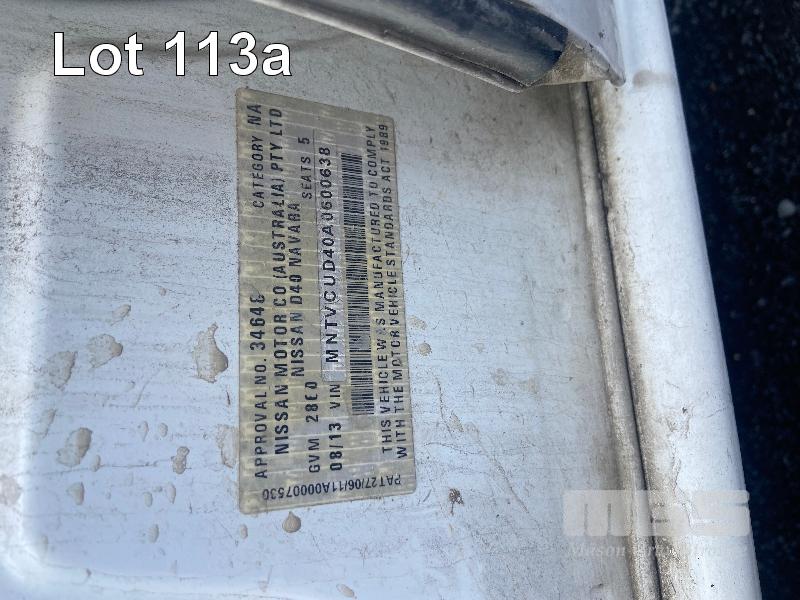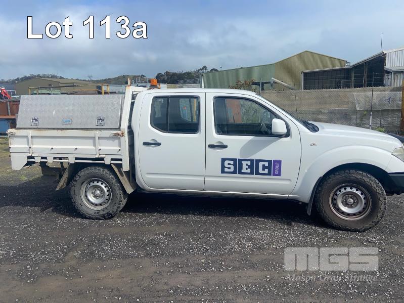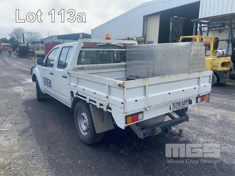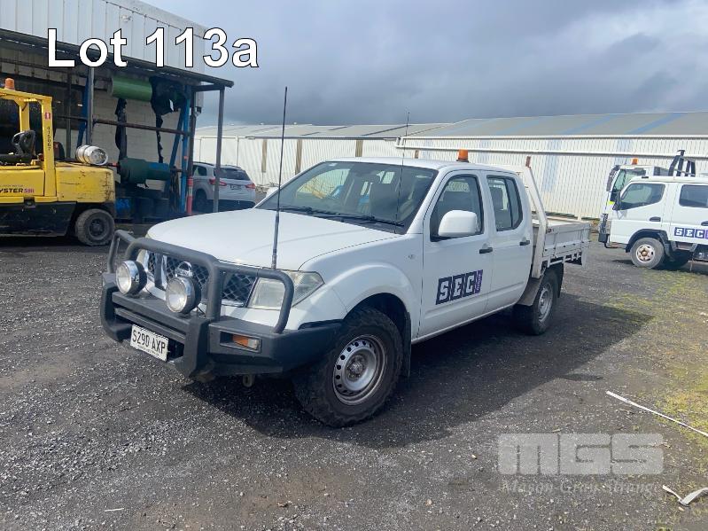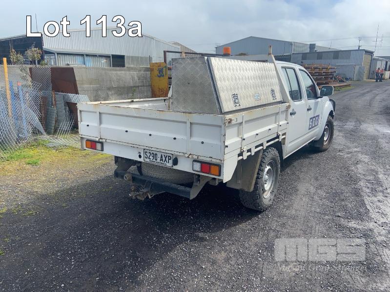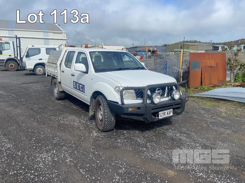 2013 NISSAN NAVARA D40 DUEL CAB UTE 4WD REG: S290 AXD (SA) (EXPIRED) VIN: MNTVCUD40A0600638 ODO: 323,444km 5 SPEED MANUAL, TURBO DIESEL, WHITE, 4 DOORS, 4WD AIR BAG, BULL BAR, SPOT LIGHTS, STEEL TRAY, TOOL BOX, TOW BAR (NO PAPERS, WITH 1 KEY/S, NO OWNER'S MANUAL, NO SERVICE BOOKS)
