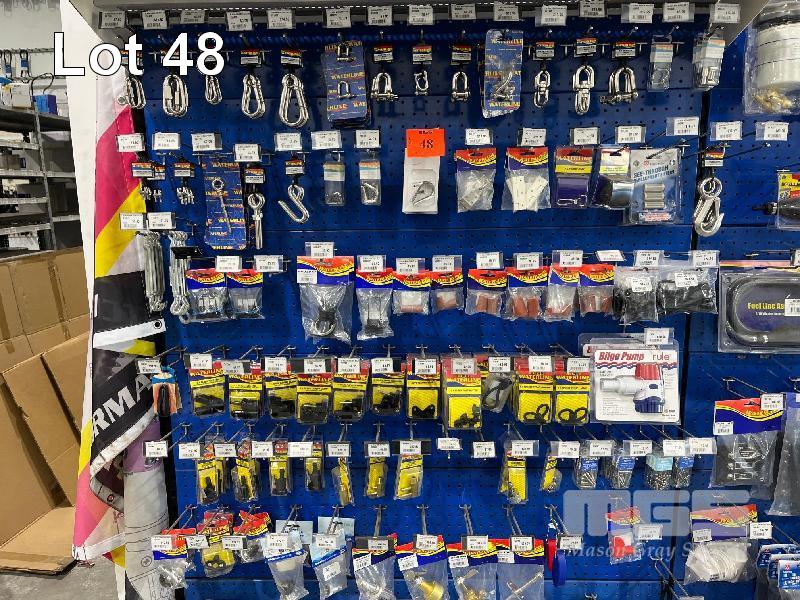 LARGE QTY WATERLINE MARINE ACCESSORIES, STAINLESS STEEL HOOKS, EYE BOLTS, THIMBLES, SWIVELS & SHACKLES PLUS WATER LINE BRASS HOSE FITTINGS, CLAMPS, BUNGEE STRAPS, STAINLESS STEEL SCREWS & POP RIVETS (CONTENTS 1 SHADOW BOARD)