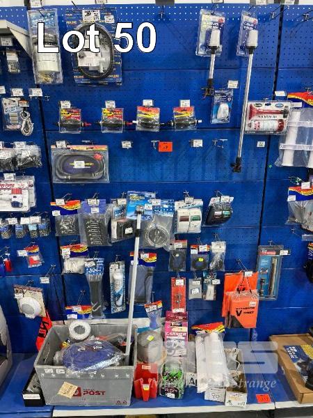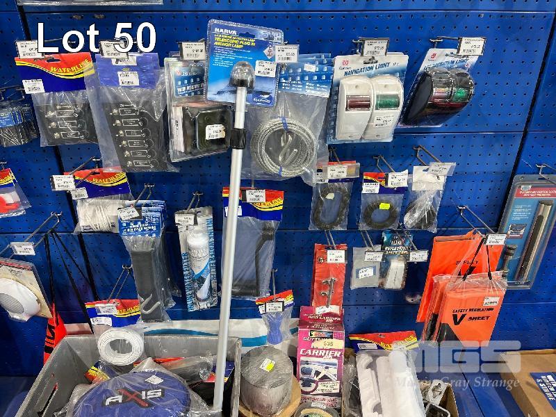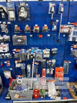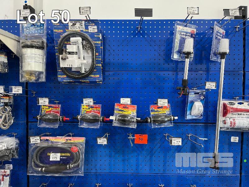 LARGE QTY MARINE ACCESSORIES & SPARES, PRIMER BULBS, MARINE WATER SEPARATING FUEL FILTER KIT, TELESCOPIC ANCHOR LAMPS, FISHING BITE BELLS, SWITCH PANELS, NAVIGATION LIGHTS, ETC. (CONTENTS 1 SHADOW BOARD)