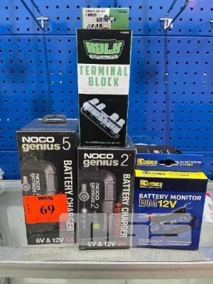 HULK TERMINAL BLOCK, CENTURY 12V BATTERY MONITOR, PROJECTA INVETER SWITCH