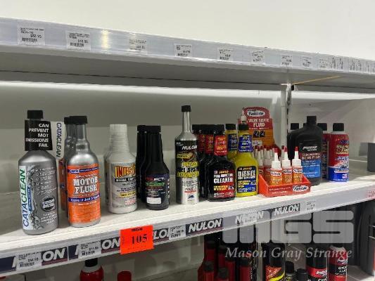 LARGE QTY AUTOMOTIVE FLUIDS, RADIATOR FLUSH, COOLANT, STOP LEAK, WATER WETTER, MOTOR FLUSH, INJECTOR CLEANER, FUEL CLEANER, STARTER FLUID ETC. (CONTENTS OF 1 SHELF)