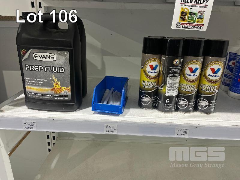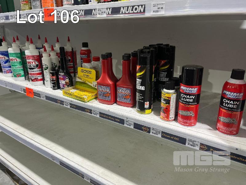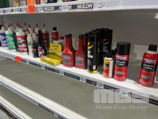 LARGE QTY AUTOMOTIVE FLUIDS, INJECTOR CLEANER, OIL STABILISER, AIR TOOL OIL, BELT DRESSING, CHAIN LUBE, STICK LUBE, STOP LEAK ETC. (CONTENTS OF 1 SHELF)