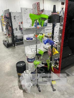 ASSORTED FUNNELS, BUCKETS, DRAIN PANS, FLUID PLUMS, 2 x VERTICAL PRODUCT STANDS