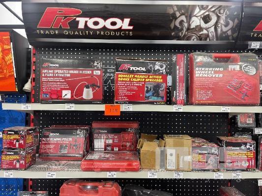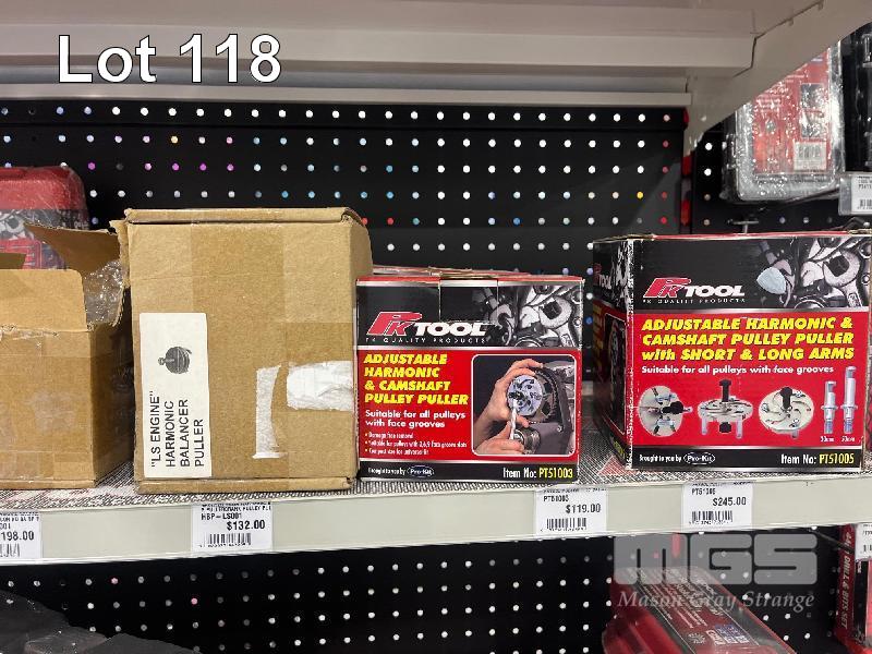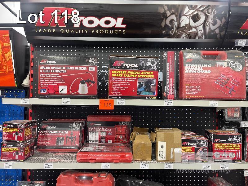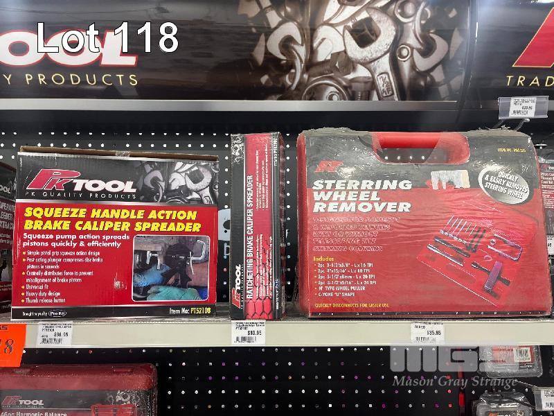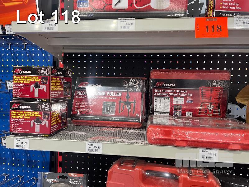 BRAKE BLEEDER KIT, 2 x BRAKE CALIPER SPREADER KITS, STEERING WHEEL REMOVAL KIT VARIOUS GEAR PULLER SETS SUIT PILOT BEARINGS, HARMONIC BALANCER, CAMSHAFT ETC. (CONTENTS OF 2 SHELVES)