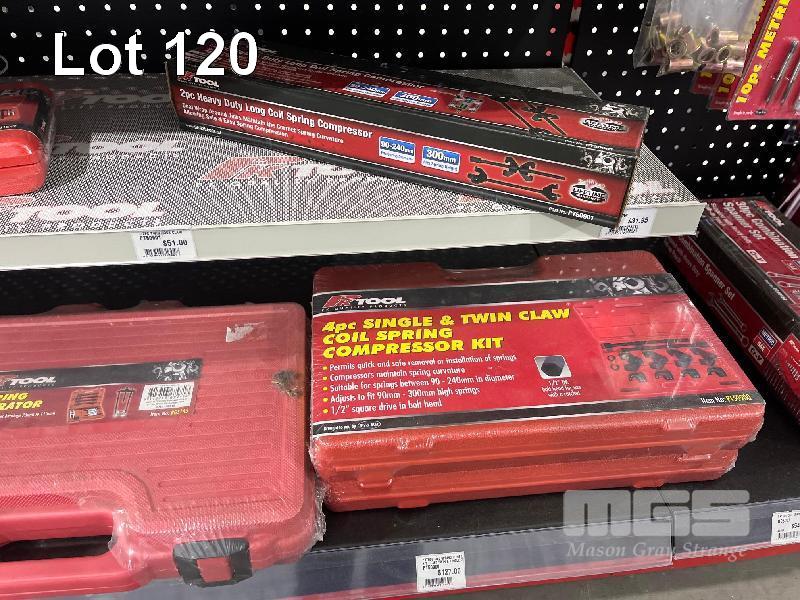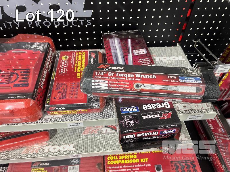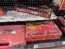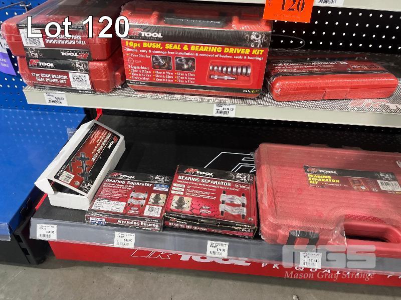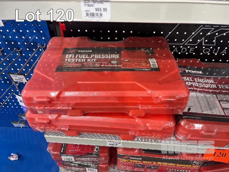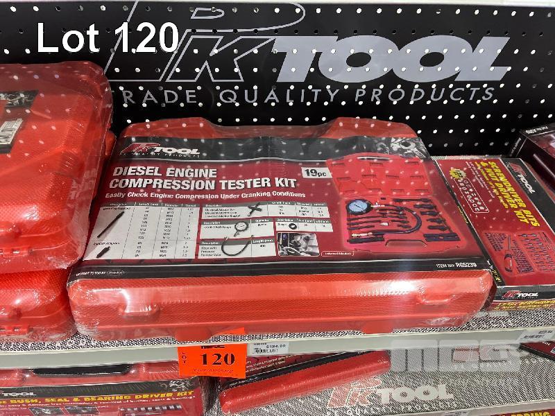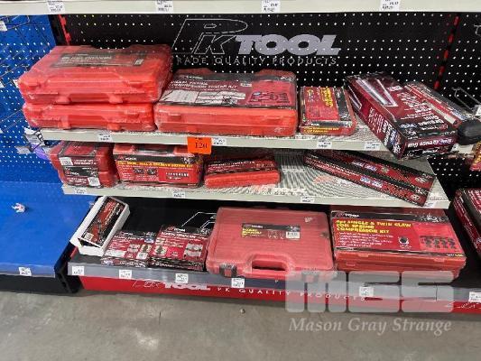 FUEL PRESSURE TEST KITS, DIESEL ENGINE COMPRESSION TESTER, 1/4 TORQUE WRENCH, GREASE GUN, BUSHING REMOVAL KIT, BEARING SEPARATORS ETC. (CONTENTS OF 3 SHELVES)