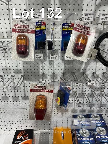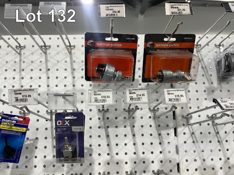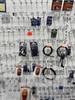 QTY ASSORTED 12V ACCESSORIES, IGNITION SWITCHES, ROCKER SWITCHES, ANDERSON EXTENSION LEADS, LED LAMPS, ETC. (CONTENTS OF 1 SHADOW BOARD)