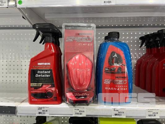 QTY MOTHERS CAR CLEANING PRODUCTS: WASH & WAX, INSTANT DETAILER, MAG WHEEL POLISH, WHEEL & TIRE CLEANER, UPOLSTERY CLEANER, NATURALLY BLACK, (CONTENTS OF 1 SHELF)