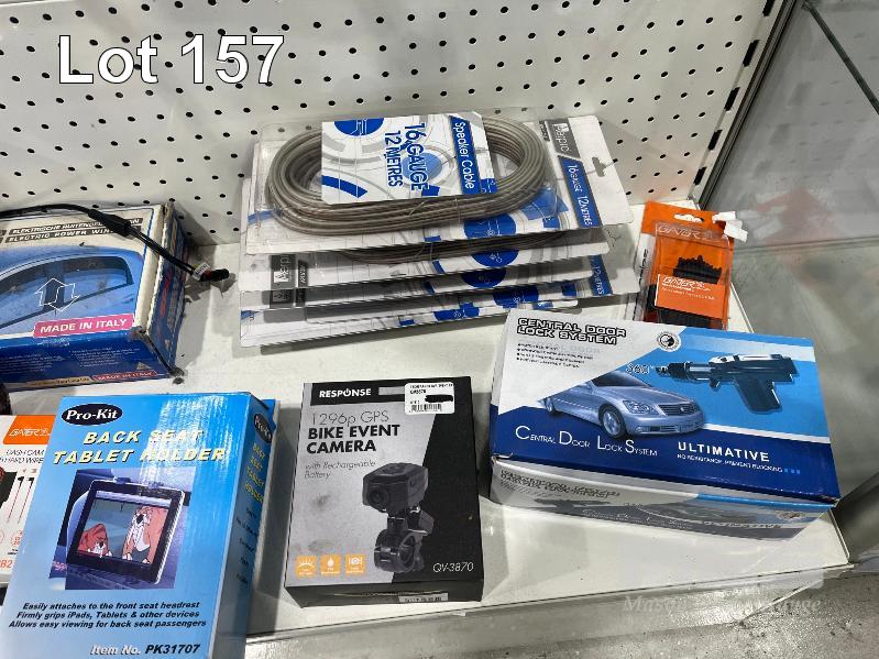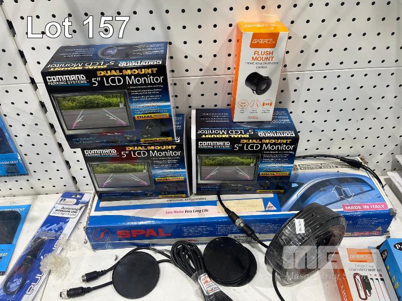 3 x 5" LCD MONITORS, SPEAKER CABLE, CENTRAL LOCKING SYSTEM, ASSORTED BATTERIES, WIRELESS CHARGING PADS, NOISE SUPPRESSOR ETC. (CONTENTS OF 1 SHELF)
