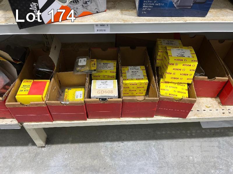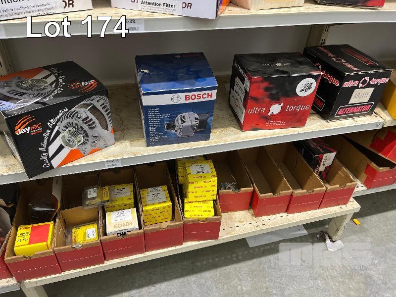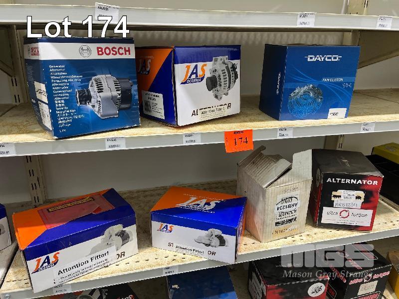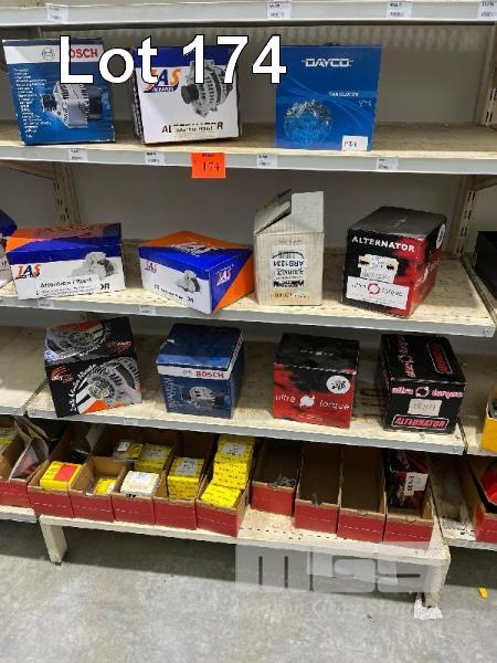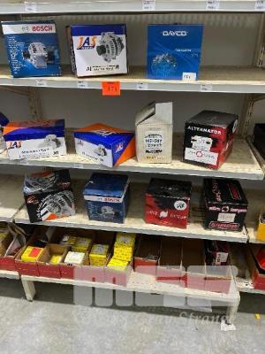 DAYCO FAN CLUTCH, BOSCH ALTERNATORS, JAS STARTER MOTORS, DISTRIBUTOR CAPS (CONTENTS OF 4 SHELVES)