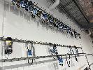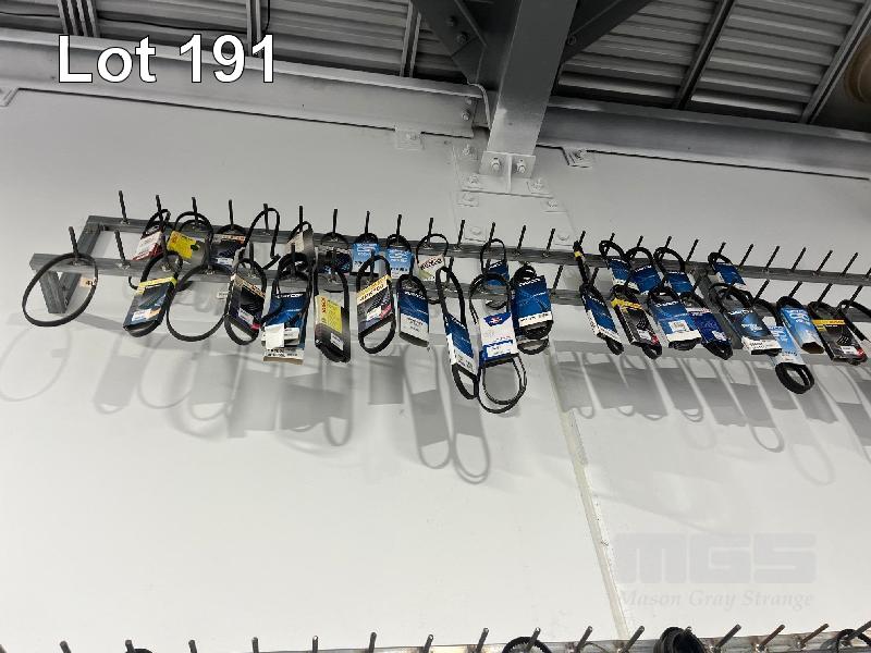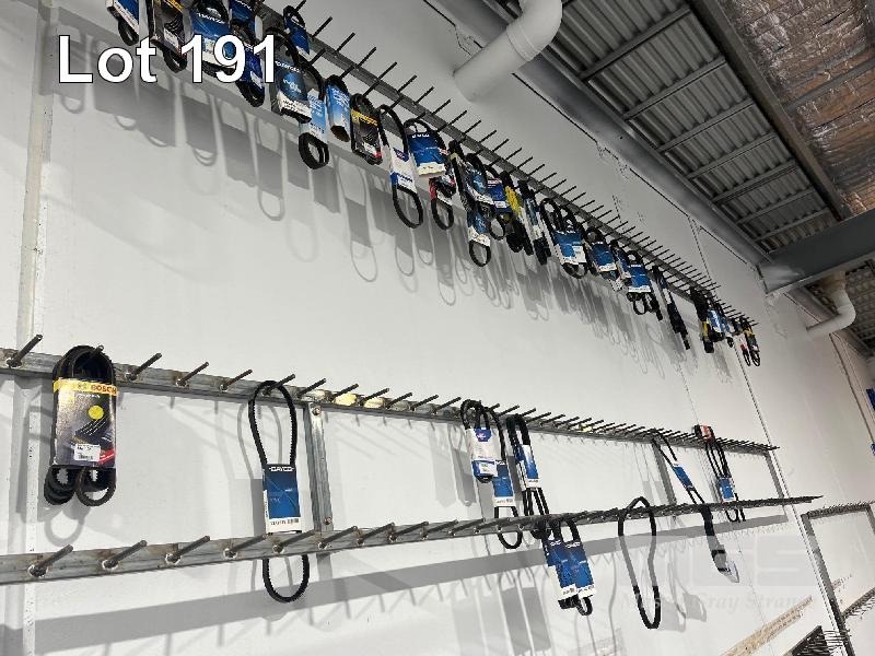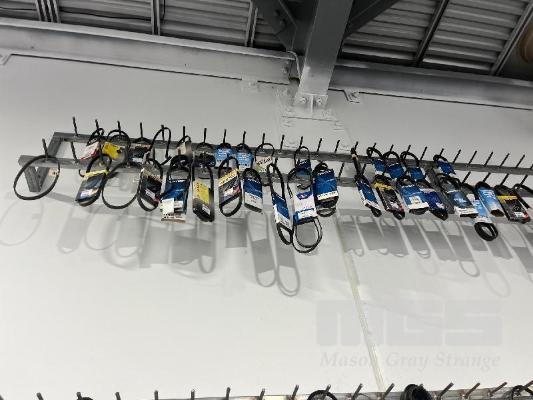 LARGE QTY ASSORTED V BELTS & RIBBED BELTS, 2 x WALL MOUNT BELT RACKS INCLUDED , APPROX 6m LONG
