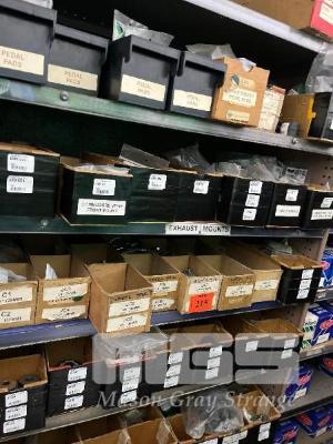 LARGE QTY ASSORTED STAINLESS STEEL EXHAUST HANGERS, RUBBER EXHAUST MOUNTS, PEDAL PADS, BUSHINGS, AIR HOSES, ETC. (CONTENTS OF 1 BAY)