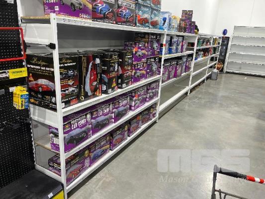 PAIR OF 5 TIER STEEL PRODUCT SHELVING UNITS, EACH UNIT: 4900 x 1800mm (H)