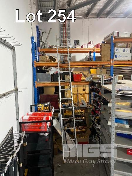 PALLET RACKING MEZZANINE FLOOR COMPRISING OF 6 x UPRIGHTS 3600mm 26 x CROSSBEAMS 2640mm INCLUDES EXTRA BAY OF PALLET RACKING 2 x UPRIGHTS 2400mm 6 x CROSSBEAMS 2640mm WITH GORILLA EXTENSION LADDER RATED 150kg, 2400 - 3900mm